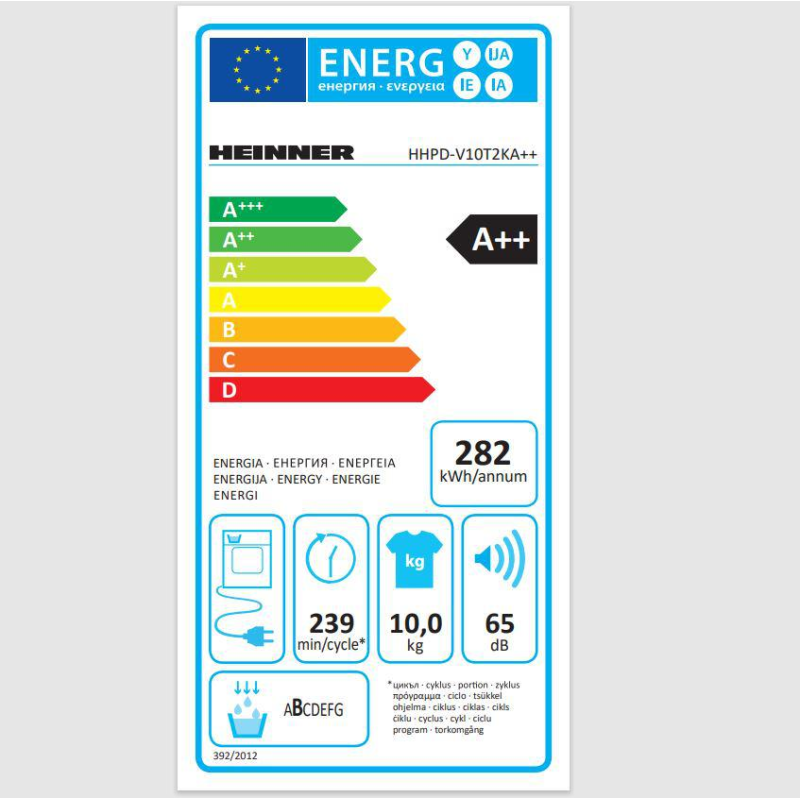 Sušilica sa toplinskom pumpom Heinner HHPD-V10T2KA++, Kapacitet 10kg, Energetski razred A++, 15 programa sušenja, LED zaslon, Program brzo sušenje 20 min, Ekspresni program 34 min, Program osjetljivo rublje, Odgođena funkcija pokretanja, Funkcija protiv gužvanja, Reverzibilna vrata, Svjetlo u bubnju, Birač razine sušenja, indikator čišćenja filtra , Indikator za prikupljanje vode, Zaključavanje pristupa djetetu, Dimenzije ( ŠxDxV): 59,6×60,9×84,5 cm, Boja: Bijela
