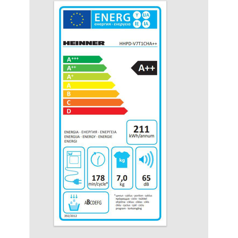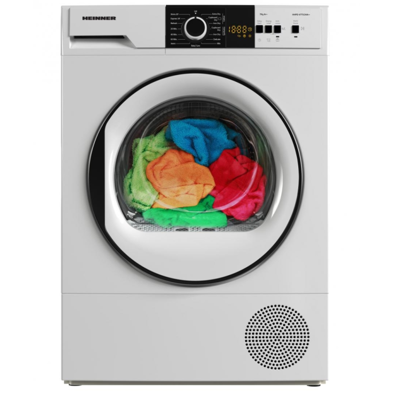 Sušilica sa toplinskom pumpom Heinner HHPD-V7T1CHA++ , Kapacitet 7 kg, Energetski razred A++, 15 programa sušenja, LED zaslon, Program brze košulje 20 min, Ekspresni program 34 min, Program za osjetljivo rublje, Odgođena funkcija pokretanja, Funkcija protiv gužvanja, Svjetlo u bubnju, Biranje razine sušenja, indikator čišćenja filtra, Indikator punog spremnika za prikupljanje vode, Zaključavanje pristupa djetetu, Dimenzije ( ŠxDxxV): 59,6×63,9×84,5 cm, Boja: Bijela
