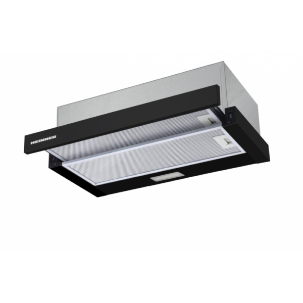 Heinner HTCH-440GBK kuhinjska teleskopska napa, apsorpcijska snaga 325 mɜ/ h, 1 motor 65W, osvjetljenje 1x65W, 2 stupnja prijenosa, filtri s 3 sloja aluminija, promjer ispušne cijevi podesiv od 150 do 120 mm, maksimalna razina buke 63 dB, boja: crna Specifikacije proizvoda Neto dimenzije Visina 19,5 cm Širina 60 cm Dubina 30 – 43 cm Težina 7,3 kg