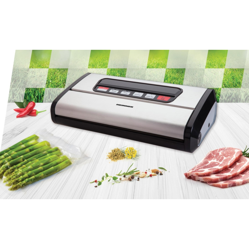 Heinner HAV-165BKSS vakuumski i brtveni uređaj, vakuum i brtvljenje, suhi/mokri vakuum, funkcija brtvljenja, dvostruka pumpa, dvostruko brtvljenje, kontrola dodira, dva načina: normalan / osjetljiv, Funkcija pulsa, sustav hlađenja brtvenom trakom, silikonska brtva, rola vrećice uključena 20×200 cm, crijevo spremnika, ugrađeni rezač, prostor za pohranu valjaka vrećica, kompatibilan s širinom vrećica 32 cm, kapacitet vakuuma: 16L / min, tlak: -0,85 bara, snaga: 165W, kućište od nehrđajućeg čelika
