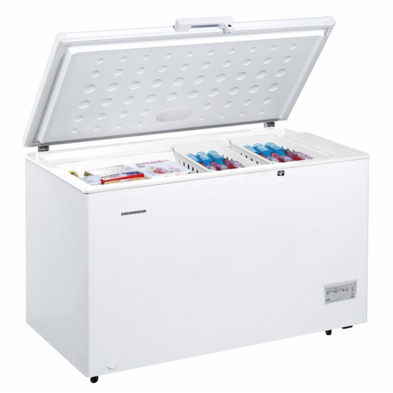 Heinner HCF-380NHF+ zamrzivač, energetski razred: F. ukupni kapacitet: 371L, elektroničko upravljanje, otpornost na hladnoću (radi na niskim temperaturama do -15 ° C), otpornost na varijacije napona 175 ~ 255V, vodootporni zaslon, LED svjetlo, funkcija “brzo zamrzavanje”, 2 plastične košare, ručka s bravama, ručno odmrzavanje, valjci za jednostavan prijevoz, kapacitet smrzavanja: 18 kg / 24h, Dimenzije (ŠxDxV): 130 x 70,5 x 85 cm, boja: bijela