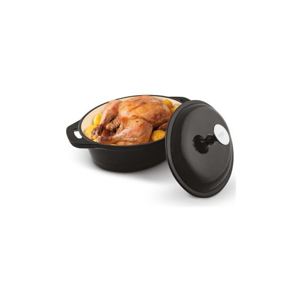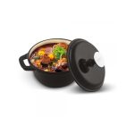 Emajlirano posuđe od lijevanog željeza – visoka kvaliteta, izdržljiv, tvrd i nepromjenjiv materijal. Unutarnji i vanjski sloj cakline otporan je na udarce i pukotine. Otpornost na visoke temperature do 280 ° C. Ručke velikog formata omogućuju ravnomjernu raspodjelu težine i sigurno držanje. Jednostavno održavanje i čišćenje. Promjer: 25,5 cm Kapacitet: 4,3 L Boja: crna Materijal posuđa: lijevano željezo Završena obrada : emajlirano