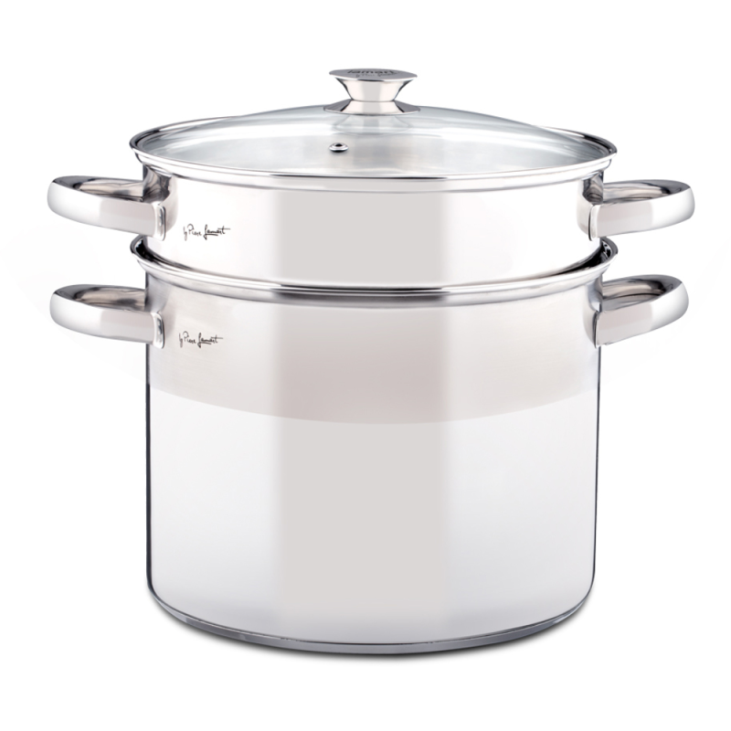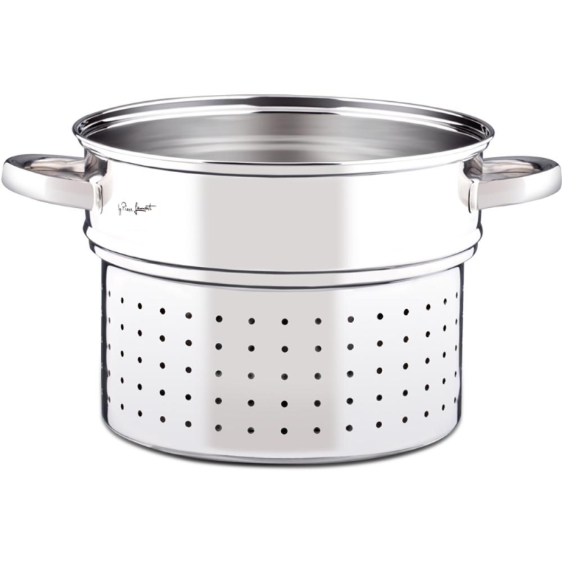 Materijal Nehrđajući čelik Promjer 24 cm Dimenzija 17,5×24 cm Kapacitet 8 l Induction Da Boja NEHRĐAJUĆI ČELIK Visina 17,5 cm Lonac za tjesteninu od 8 litara Lonac za tjesteninu izrađen od prvoklasnog nehrđajućeg čelika. Lonac od prvoklasnog 18/0 nehrđajućeg čelika ima masivno slojevito dno. Unutrašnji dio lonca koji je izrađen od 18/10 nehrđajućeg čelika služi za kuhanje na pari ili kao cjedilo i ima vlastite prilagođene ručke za samostalno rukovanje. Poklopac od izdržljivog stakla s izlazom za paru, za preciznu kontrolu kuhanja.