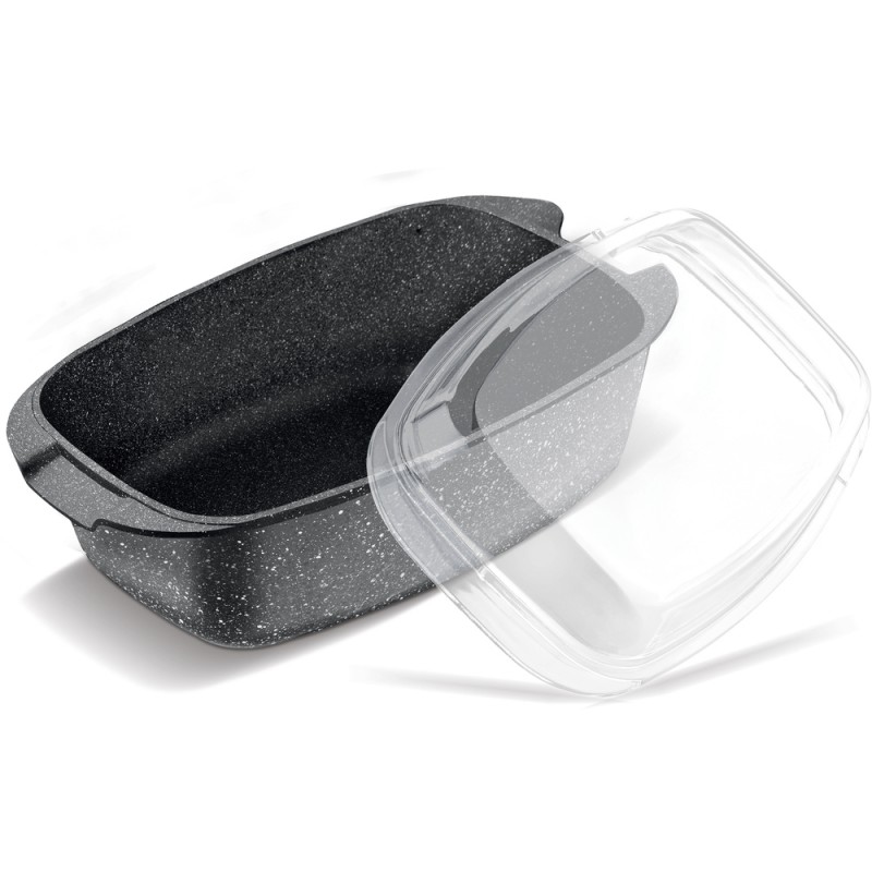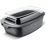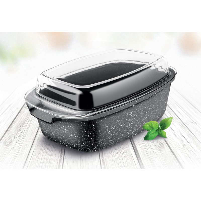 Posuda za pečenje s neprijanjajućom unutarnjom površinom za kuhanje bez masnoća Izrađen od vrlo izdržljivog aluminija. Lonac s poklopcem ima unutarnju mramornu površinu otpornu na abraziju. Mramor protiv ljepljenja hrane vrlo je otporan na toplinu, sprječava zagorijevanje hrane, omogućuje zdravo kuhanje. Poklopac od izdržljivog stakla za preciznu kontrolu kuhanja. Lako održavanje i čišćenje. Kapacitet : 7,5 l Mjere: 32 x 21 x 16 cm Materijal: aluminij / staklo Boja: crna