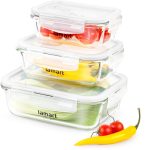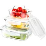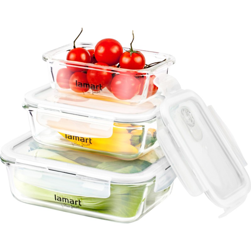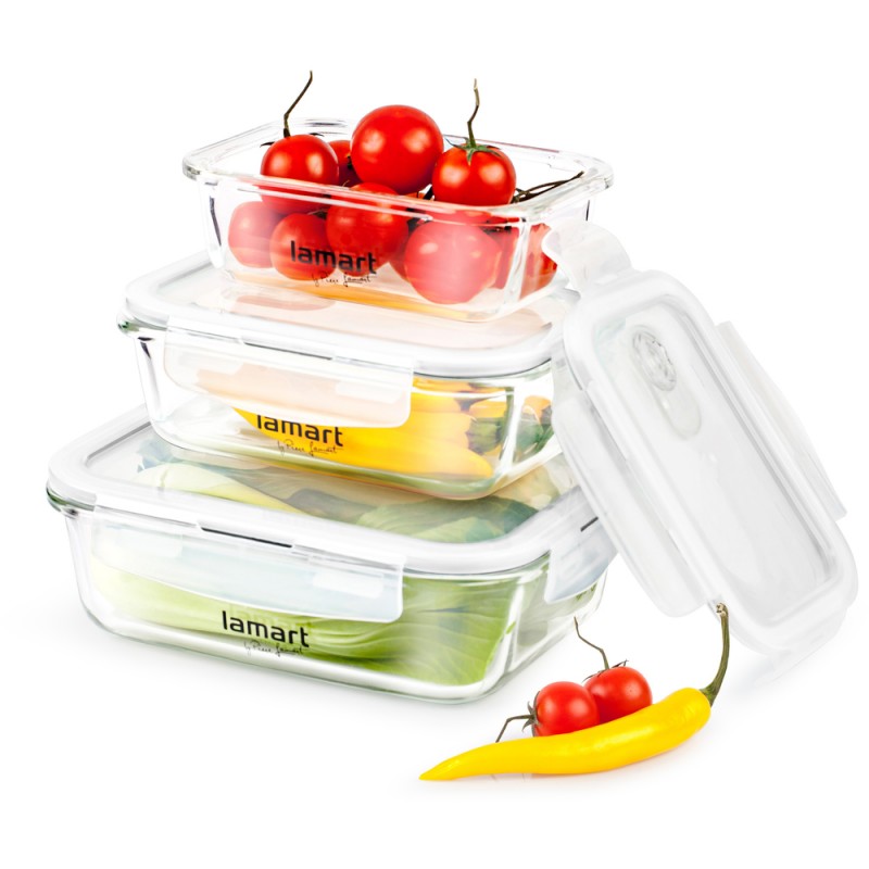 Komplet praktičnih i pouzdanih kutija za pohranu i prenošenje hrane. Ozrađeno od otpornog stakla i plastike s kvalitetnom silikonskom brtvom na poklopcu koja je nepropusna za zrak i vodu. Ventil za prozračivanje i odvlaživanje hrane. Hrana dulje ostaje svježa, zadržava okus i ne curi prilikom transporta. Prikladno za hladnjak, zamrzivač, mikrovalnu pećnicu i perilicu posuđa. -20°C do 110°C. Napomena: staklenim proizvodima rukujte pažljivo i nemojte ih koristiti ako napuknu Kapacitet 370 ml; 640 ml; 1040 ml Mjere 15x11x6,2 cm; 18x13x6,8 cm; 20,5×15,5×7,5 cm