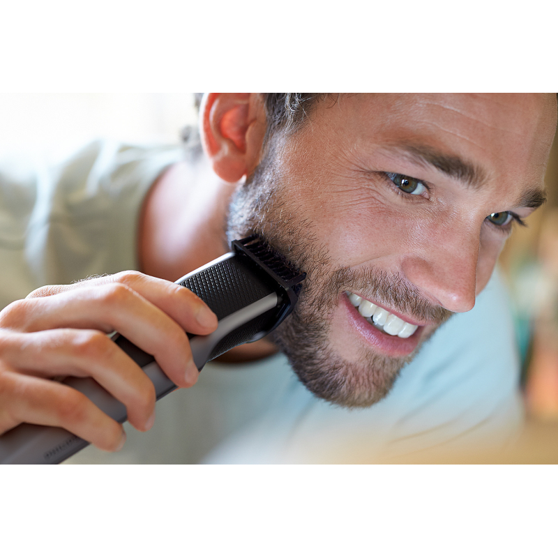 Ovaj podrezivač s inovativnim sustavom Lift & Trim podiže i hvata više nisko položenih dlačica radi postizanja učinkovitih i ravnomjernih rezultata. Na taj ćete način lako postići željenu trodnevnu, kratku ili dugu bradu.Postavke za preciznost do 0,5 mmOštrice obložene titanijem60 min bežične uporabe/1 h punjenjaSustav Lift & Trim20 postavki koje se mogu zaključati, 0,5 – 10 mm uz preciznost od 0,5 mm.Svjetla naznačuju kada je baterija pri kraju, prazna, puna ili se puni.Savršeno, a ipak nježno podrezivanje svaki put. Podrezivač ima oštrice od titanija koje se same oštre – blago se dodiruju i tako se oštre tijekom podrezivanja kako bi ostale izuzetno oštre i učinkovite kao i prvog dana.Tehnologija DuraPower smanjuje trenje oštrica, čime se motor i baterija štite od preopterećenja. Na taj način vrijeme trajanja baterije podrezivača povećava se za 4 puta.