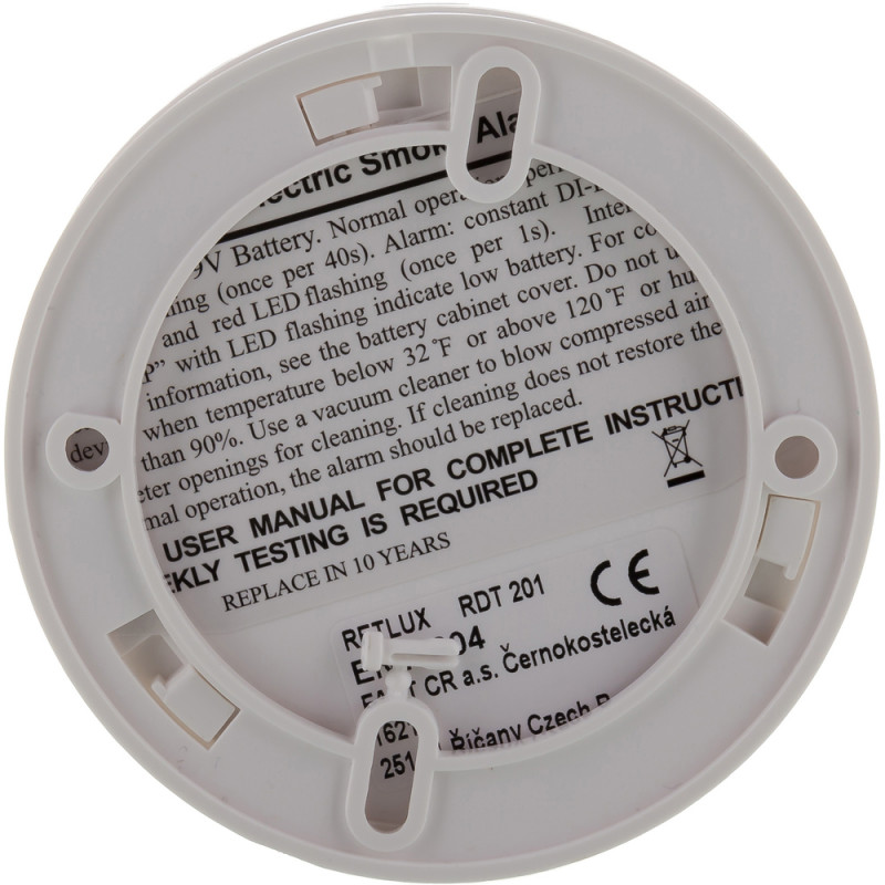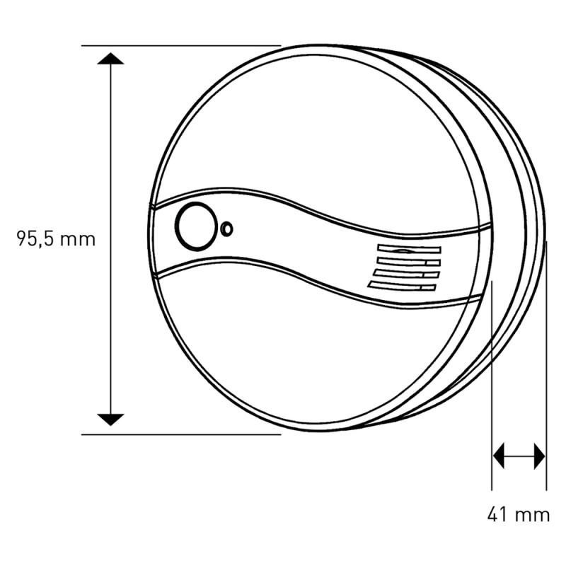 Detektor dima aktivira alarm čim dim stigne do senzora. Detektor dima montiran je u središtu prostorije na stropu ili na udaljenosti od najmanje 1 metra od zida. Pričvršćivanje se vrši pričvršćivanjem utičnice za brzo otpuštanje na podlogu. Detektor dima pokreće 9V baterija.Specifikacije: Napajanje: Baterija, Zvuk alarma: 85 dB (3 m) Tip senzora: Fotoelektričnivijek trajanja baterije nakon signal upozorenja na nisku bateriju: > 30 danaRaspon temperature: 0 ° C ~ 49 ° C (32 ° F ~ 120 ° F) Dimenzije:95 × 41 mmU skladu sa standardima: EN14604:2005; GB4715-2005; Ul217Zona detekcije: 80 m kada se instalira na visini od 6–12 m 60 m na visini ugradnje od < 6 m