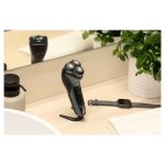Tehnologija izravnog pogona omogućuje napajanje izravno iz električne utičnice tijekom punjenja Uređaj se napaja iz baterije Uređaj se napaja iz utičnice dok se puni Uređaj se napaja izravno iz utičnice dok se puni, stoga nije potrebno čekati da se baterija do kraja napuni. Izvanredno tihi profesionalni motor visoke brzine osigurava udobno brijanje brade i brkova  Namijenjen za suho brijanje Oštrice od nehrđajućeg čelika Bočni šišač za savršeno podešavanje stila Ergonomska drška sprječava klizanje u ruci Može se potpuno prati u tekućoj vodi LED indikator napunjenosti baterije Vrijeme rada na baterije do 50 minuta Tehnologija brzog punjenja omogućuje potpuno punjenje za 2 sata Prekidač za UKLJUČIVANJE/ISKLJUČIVANJE Funkcija sigurnosnog zaključavanja sprječava nehotično uključivanje Ugrađena Li-ionska baterija kapaciteta 700 mAh Priloženi dodaci: Četkica za čišćenje Kabel za punjenje Plastični štitnik oštrice Dužina kabela napajanja: 195 cm Masa: 177 g