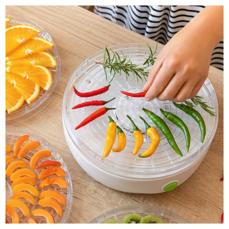 NUDIM SUPER KVALITETNU SUŠENU HRANU Ja sam Sencor Food Dryer koji će vam pružiti super kvalitetnu sušenu hranu koju trgovine ne nude po razumnoj cijeni. Isprobajte neke sušene poslastice koje još niste probali ili osušite uspješnu žetvu i mnoge druge dobrote koje vam padaju na pamet. Ne morate više brinuti o jedenju suhih proizvoda s bojama, konzervansima i viškom šećera i soli! Domaći proizvodi uvijek će vam biti po volji, puni vitamina, minerala i vlakana! Vjerujte mi, nećete znati što prvo osušiti ili kušati! Naše tržište nudi ogromnu količinu proizvoda i recepata koji se mogu koristiti za sušenje. Pomiješajte svoje omiljeno voće, koje može biti šumsko voće, tropsko voće ili bilo koje sezonsko voće i dodajte mu svoj omiljeni mirisni začin. Također mogu sušiti sve vrste povrća za kućne arome, dok će ljubitelji mesa također biti zaintrigirani, jer ga mogu osušiti u nježnom okusu. Poslušajte svoje ideje i okusne pupoljke i iskoristite me da osušite punu smočnicu suhih delicija. Suho meso Bilo koja vrsta voća Povrće i gljive Bilje i cvijeće Orašasti plodovi i sjemenke RAVNOMJERNO SUŠIM PREHRAMBENE PROIZVODE Imam ugrađeni ventilator u sredini tijela koji stvara vrući zrak u smjeru prema gore i bočno kako bih ravnomjerno osušio sve prehrambene proizvode. Sve što trebate učiniti je izrezati odabrane dobrote, položiti ih na zaslone od jednog do pet katova i pritisnuti gumb za napajanje! To je vrlo jednostavan proces koji uopće ne traje dugo. Nudim 5 zaslona s posebnom rešetkastom konstrukcijom promjera 23 cm u paketu. Zasloni se mogu postaviti na visinu sušenja do 3 cm, ovisno o odabranim prehrambenim proizvodima. SAVRŠENO SAM TIH I EKONOMIČAN. Jeste li znali da imam samo 20 dB (A)? To je izuzetno niska razina buke koja neće ometati bilo koju kućansku aktivnost, čak i ako radim neprekidno nekoliko sati. Ne morate brinuti o visokoj potrošnji električne energije jer je moja potrošnja energije ekonomičnih 230-250 W. DEHIDRATOR HRANE POGODAN JE ZA PRIPREMU: – suho voće (kruške, šljive, marelice, banane itd.) -Grožđice – suho povrće za juhe – sušene rajčice – suho bilje – biljni čajevi (metvica, cvijet lipe, kamilica itd.) – sušene gljive za juhe i ostala jela – sušene naranče za dekoraciju – sušene sjemenke bundeve – sušene latice za potpourri – suho meso – sušena riba FUNKCIJE I SVOJSTVA 5 regala za sušenje kao standardUšteda prostora pri korištenju manjeg broja regala (moguće samo s jednim stalkom)Promjer stalka za sušenje: 23 cmRaspoloživa visina po razini: 2,5 cmIntegrirani ventilator pomaže u postizanju ravnomjernog sušenja na svim razinama.Dizajn regala za sušenje sprječava stvaranje kalupa i optimizira cirkulacijuzraka Prozirni poklopac i regali omogućuju provjeru procesa sušenja u bilo kojem trenutku.Regali za sušenje i poklopac mogu se oprati u perilici posuđaTermalni osigurač protiv pregrijavanja DIMENZIJE I SPECIFIKACIJE Ulaz snage: 250WDuljina kabela za napajanje: 0,9 mDimenzije (Š x D x V): 230x230x190/230mmTežina: 1,3 kgNapon i frekvencija: 220-240V, 50Hz