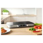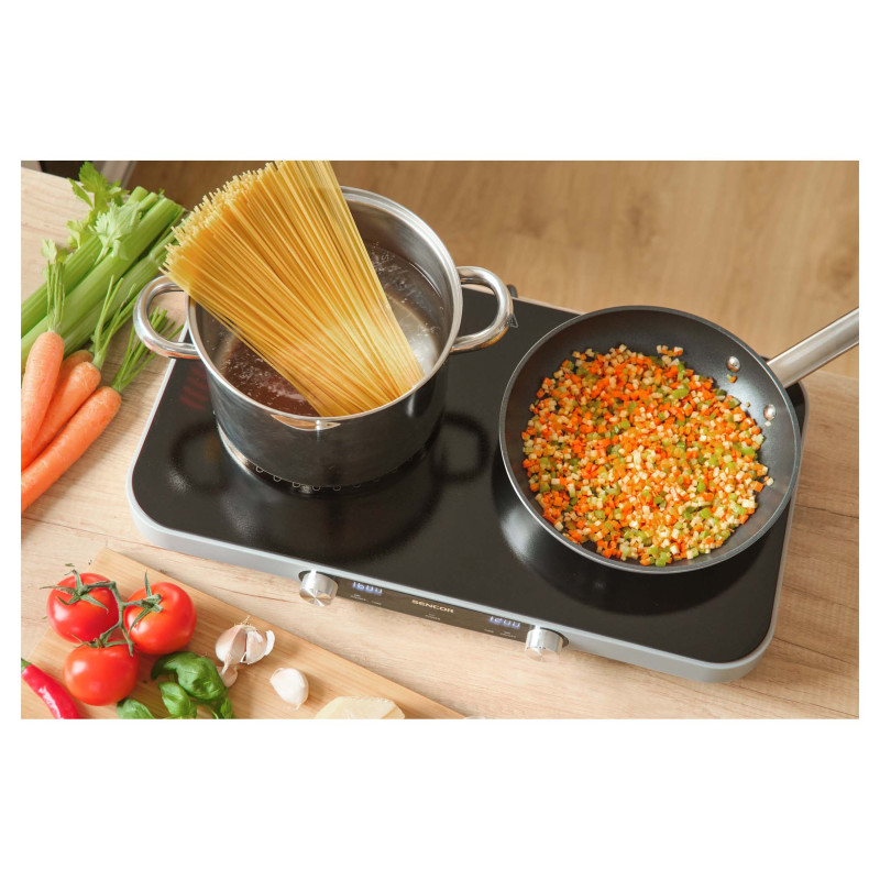 SCP 2803BK SmoothCook nudi vam visoke performanse dviju staklenih keramičkih ploča za kuhanje od 20 cm. Brzo se kuha, ima promjenjivu kontrolu u koracima od 100 W. Ne morate pohađati dodatni tečaj da biste ga koristili, jednostavan je i intuitivan. Zaslon za svaku ploču za kuhanje prikazuje trenutnu izlaznu snagu, koju je lako postaviti i promijeniti pomoću kromiranih gumba. Ima pristojan zaslon dizajniran za komunikaciju svega važnog bez ometanja.Tajmer je jednostavno postavljen u rasponu od jedne minute do tri sata. Održavanje je također bez problema – monolitna gornja pokrovna ploča lako se briše. Monolitna površina ploče također osigurava veću sigurnost, a stabilnost posuđa na ovoj ploči za kuhanje daleko je superiornija od mnogih standardnih ploča za kuhanje.Značajke: 2 infracrvene / staklene keramičke peći Snaga: 3 500 W (2 200 W + 1 300 W)Promjer ploče za kuhanje 20 cmPodešavanje snage u koracimaod 100 W Monolotska površinakoja se lako čisti Jednostavno digitalno upravljanjeKlasični kromirani gumbiprijenosni – Idealno za vikendice Neovisanzaslon s bijelim znamenkama i upravljačkim gumbima za ploče za kuhanjeTajmer (1 minuta do 3 sata) Dvostruki toplinski osiguračDimenzije i specifikacije Duljina kabelaza napajanje: 90 cm Dimenzija proizvoda: 54,5 x 30 x 7,5 cm Težina: 3,8 kgTehnički opisSnaga: 3 500 W (2 200 W + 1 300 W)Podešavanje snage u: Koracimaod 100 W Promjer ploče za kuhanje: 20 cmTajmer: DaDuljina kabela za napajanje: 90 cm Dimenzija proizvoda: 54,5 x 30 x 7,5 cmTežina: 3,8 kgBoja: Tamno siva