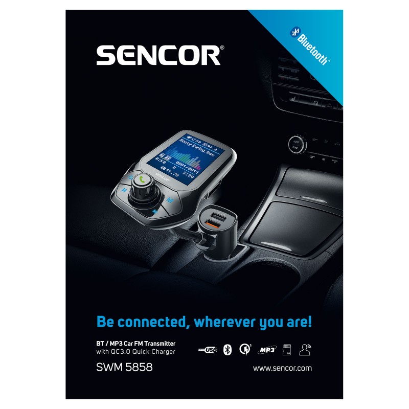 Sencor FM transmiter SWM 5858 BT · Višebojni TFT LCD zaslon s dijagonalom (4,7 cm) · podrške: Bluetooth, USB Flash disk, TF kartica, AUX-IN, MP3, WMA, FLAC, WAV i HandsFree · 3 x USB utor (1 x QC3 .0 utor za punjenje, 1 x brzo punjenje, 1 x glazbeni utor) · QC3.0 priključak za brzo punjenje · 2 x USB priključci za punjenje: DC 5 V / 5,4 A Max. (QC3.0 + 2,4 A) · TF kartica / Micro SD Utor za karticu (do 32 GB) · Bluetooth V4.2 · AUX-IN priključak 3,5 mm · Bežični handsfree uređaj bez mikrofona za pozive · Podrška pozivima putem automatske jačine zvuka u automobilu jačine zvuka · Display Mode, volumen, FM Frekvencija, auto napon, pjesme imena, Caller ID funkcijom · Equalizer Function (Normal , Klasična, pop, rock, jazz) · Pauza kontrole glasnoće , prethodna / sljedeća kontrolnamemorija zadnje frekvencije, broja zapisa i jačine · Jednostavno prebacivanje između BT / TF / AUX-IN / USB izvora audio uređaja · Mjerač napona u sustavu napajanja u automobilu · Podesivi krak za bolji pristup priključak3,5 mm – priključak 3,5 mm M / M kabel (uključen) · FM frekvencijski raspon prijenosa: 87,5 – 108 MHz · Količina FM frekvencija: 206 · Snaga: DC 12/24 V (priključak za napajanje u automobilu) · Dimenzije: (š / h / d) 52 x 79 x 180 mm · Težina: 97 g · Garancija 24 mjeseca