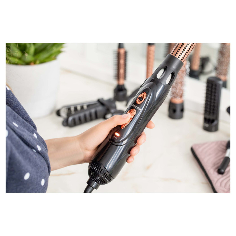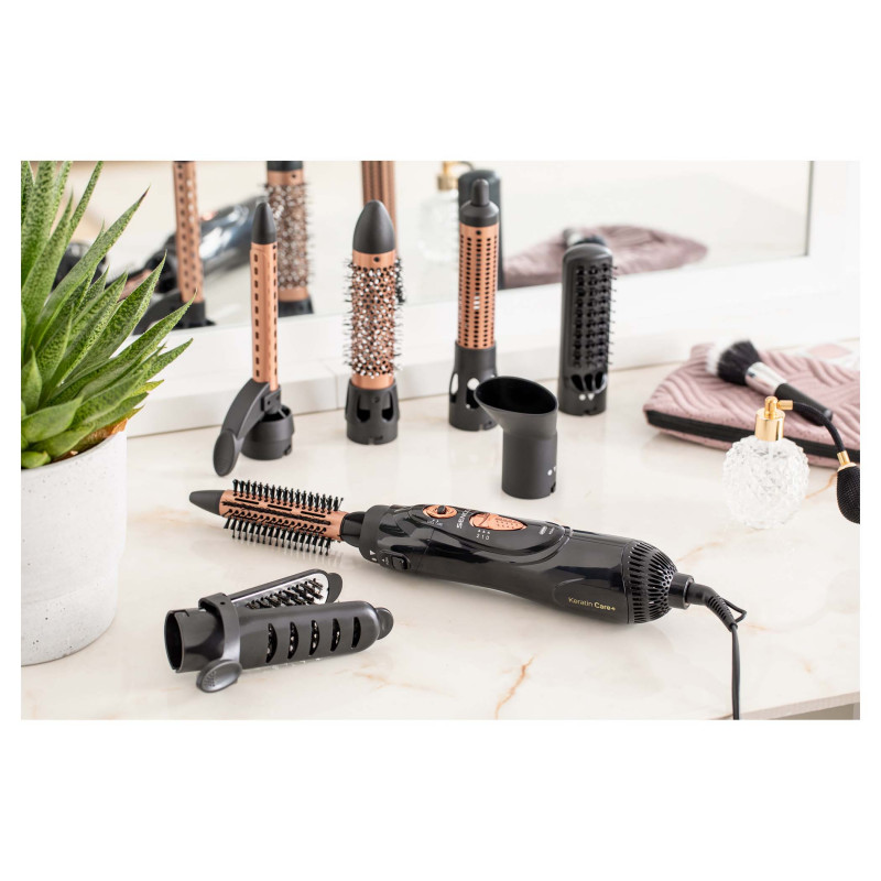 Temperatura od 2 stupnja Gumb za hladan zrak Funkcija ionizacije s antistatičkim učinkom Keratin (opis funkcije) 7 zamjenjivih priključaka Koncentrator Kliješta za kovrčanje (promjer 18 mm, radna duljina 115 mm) Okrugla četka (promjera 20 mm, radna duljina 95 mm) Pola četke (širina 39 mm, radna duljina 90 mm) Okrugla četka s uvlačivim iglama Velika okrugla četka Četka za ravnanje Adapteri za jednostavnu i brzu promjenu Viseća petljaProdužni kabel može se zakrenuti za 360 ° sprječava uvijanje i zapetljavanjeSigurnosni osigurač protiv pregrijavanjaSnaga 1000 W