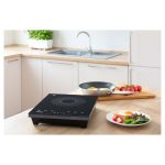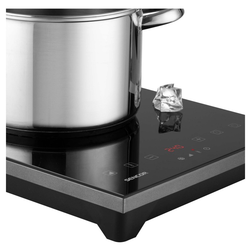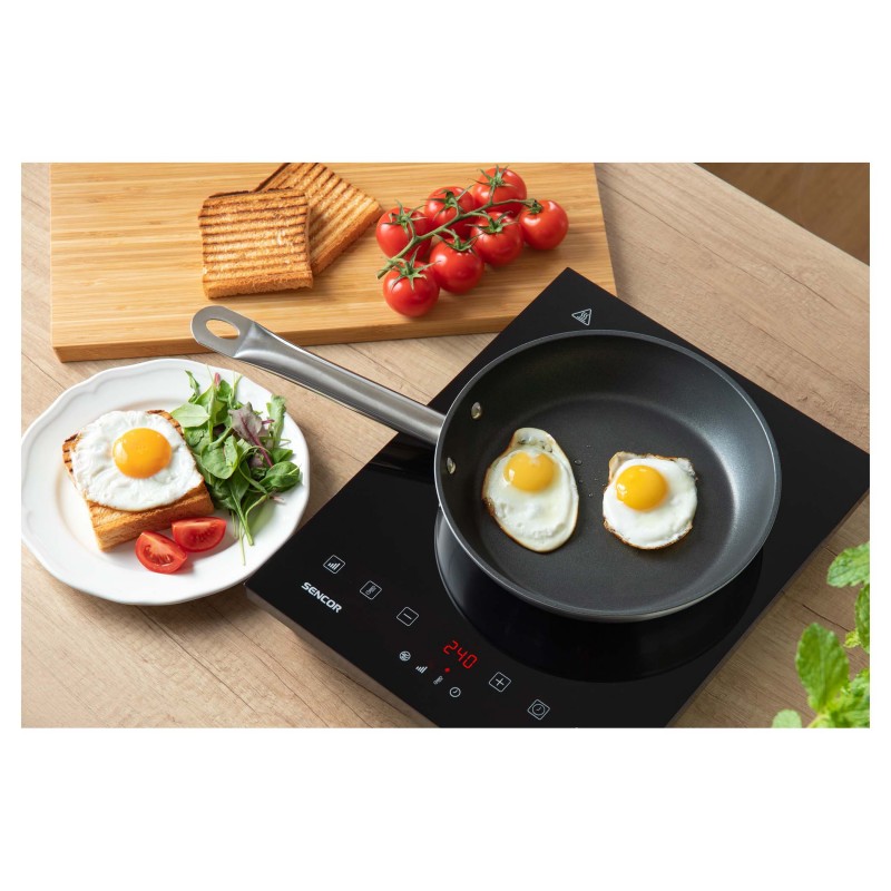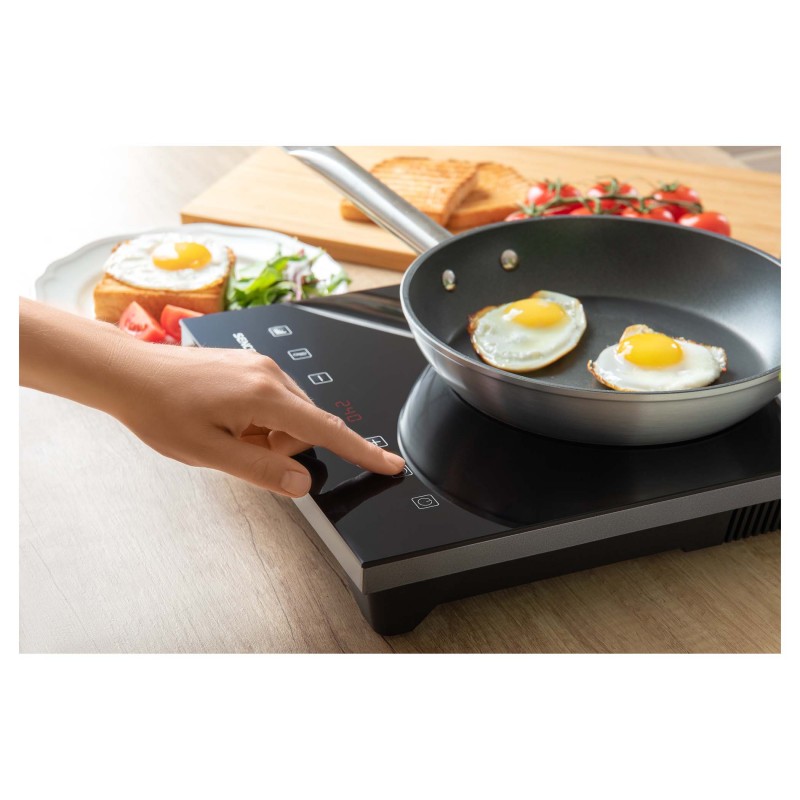 INDUKCIJSKO KUHALIŠTE TOUCHCONTROL S JEDNOM ZONOM · Jednostavno upravljanje funkcijama, temperaturom i snagom dodirom prsta · Potpuno ravno staklokeramičko indukcijsko kuhalište se lako održava · Visoko učinkovito indukcijsko kuhanje štedi vrijeme i struju Staklokeramičko indukcijsko kuhalište je hladno na dodir jer se toplina indukcijom stvara izravno u posuđu (oprez, kuhalište se može djelomično zagrijati od posuđa). Indukcijsko kuhanje štedi vrijeme (60 %) i struju (50 %). Omogućuje visoku učinkovitost (do 90 %) s minimalnim gubicima topline. Kuhalištem i pojedinačnim funkcijama se upravlja pomoću tipki na dodir. Veliki LCD zaslon sa crvenim pozadinskim osvjetljenjem daje podatke o temperaturi i snazi.Jednodijelna staklokeramička površina potpuno prekriva gornju stranu kuhališta. Time se olakšava čišćenje uređaja. Budući da se toplina potrebna za kuhanje stvara u posuđu, a površina kuhališta se ne grije izravno (samo toplinom koja prelazi na njega s posuđa), ako hrana slučajno dospije iz posuđa na kuhalište, neće se na njemu zapeći.Radi pomoću mikroprocesora.Trenutan prijenos snage bez dugog zagrijavanja.Prikladno za posuđe promjera od 12 do 26 cm.Automatsko prepoznavanje posuđa za indukcijsko kuhanje (s magnetskim dnom).Opcija podešavanja temperature / snage.Temperatura je podesiva od 60 °C do 240 °C.10 tvorničkih razina grijanja u rasponu od 200 – 2000 WMjerač vremena za odgodu isključivanja do 180 minuta.Gumb za UKLJUČIVANJE/UKLJUČIVANJE za uključivanje ili prelazak u stanje pripravnosti VISOK STUPANJ SIGURNOSTI · Automatsko prepoznavanje posuđa i automatsko isključivanje. Kuhalište se isključuje kada se posuđe skine s ploče za kuhanje ili kada se na ploču stavi posuđe koje je neprikladno za indukcijsko kuhanje. Posuđe je prikladno ako se na dno posuđa hvata magnet. · Termalni osigurač protiv pregrijavanja grijaće ploče i unutrađnjosti kuhališta sa zvučnim signalom. Prvo se oglašava signal upozorenja, zatim se kuhalište automatski isključuje. · Indikator preostale topline. Ako temperatura površine kuhališta prijeđe 80 °C (toplina koju stvara dno posuđa), na zaslonu se prikazuje upozorenje „HEAT“ (TOPLINA). Upozorenje će nestati kada temperatura površine padne ispod 80 °C. · Automatsko isključivanje kuhališta nakon 2 sata bez aktivnosti. TEHNIČKE SPECIFIKACIJE: Ulazna snaga 2000 WDimenzije (širina x dubina x visina): 300 × 380 × 65 mmMasa: 2,62 kgNapon i frekvencija: 220 V – 240 V ~ 50/60 HzMjerač vremena: do 180 minutaGrijaća ploča: 10 razina snage od 200 do 2000 WPostavke temperature od 60 do 240 °C Komande: senzorske komande na dodirTermalni osigurač protiv pregrijavanja