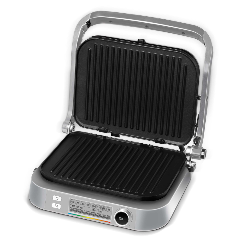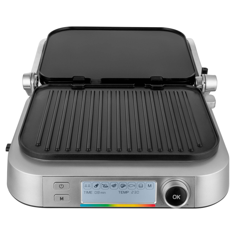 INTELIGENTNI KONTAKTNI ROŠTILJ Inteligentne postavke s LCD zaslonom za lako roštiljanje Automatski senzori uvijek osiguravaju savršene rezultate + posebno glatka ploča roštilja za pečenje povrća ili dodataka Površina CoolTouch DVIJE VRSTE PLOČA (3 KOM.): donja glatka ploča donja i gornja rebrasta ploča roštilja 3 radna položaja (zatvoreno / otvoreno 90° / otvoreno 180°) NELJEPLJIVE PLOČE ROŠTILJA Dimenzije ploče roštilja (širina × dubina): 30 × 25 cm Mogućnost pečenja bez dodavanja uljaAutomatska kontrola temperatureOdvojivo korito za kapanje uljaLako čišćenje korištenjem samo papirnatog ručnikaPloče za pečenje sigurne za perilicu suđaOdvojeni indikatori za rad i zagrijavanjeToplinski izolirana ručka prikladna i za pritiskanje sendvičaZaključavanje u zatvorenom položaju radi lakšeg nošenjaMogućnost spremanja u okomitom položajuProtuklizne nožiceUlazna snaga 2100 WDimenzije (širina × dubina × visina): 380 × 320 × 185 mmMasa: 6 kg