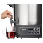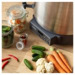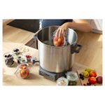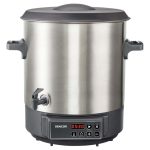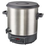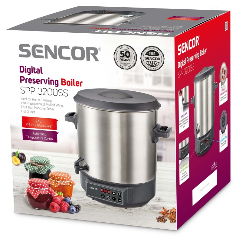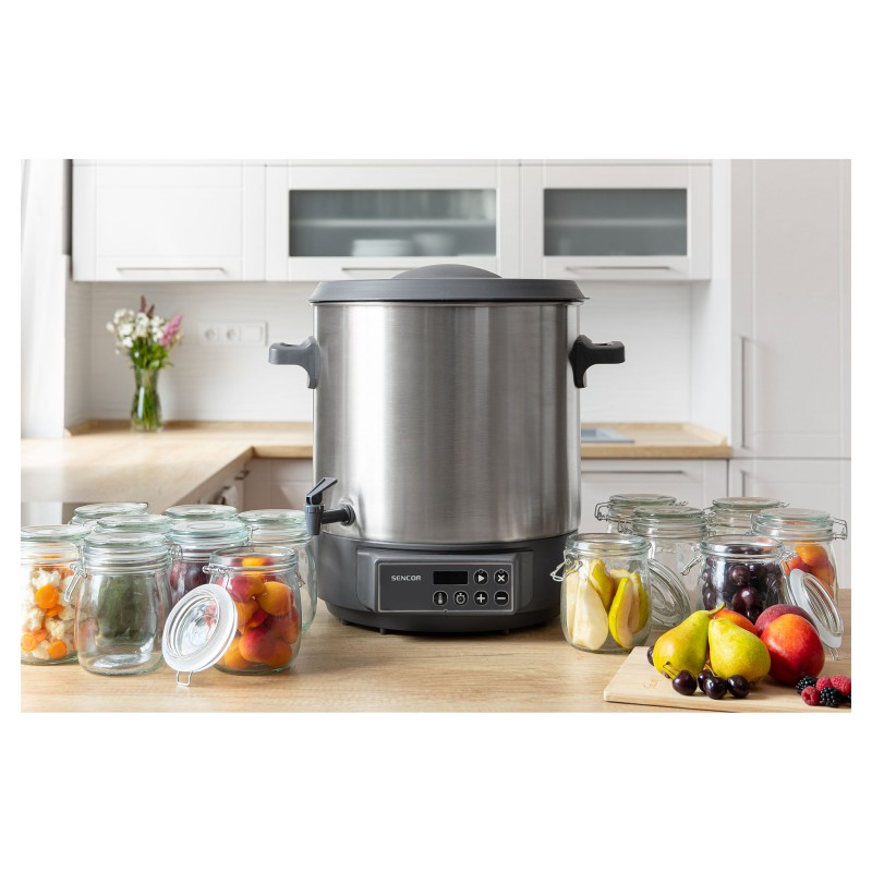 DIGITALNO KUHALO ZA PREZERVIRANJE · Prezerviranje i sterilizacija voća i povrća · Prikladno za tople napitke, juhe i gulaš · Higijenski nehrđajući čelik se lako čisti i ne utječe na okus ili miris · Ugrađena izlazna slavina prikladna za točenje kuhanog vina, čaja, punča ili drugih toplih napitaka DVA NAČINA PREZERVIRANJA: · Podesivi mjerač vremena: 5 minuta – 12 sati (u koracima od 1 minute) · Neprekidan rad – funkcija održavanja Termostat s rasponom temperature između 30 °C i 100 °C (u koracima od 1 °C )Automatska kontrola temperatureZvučni signal za dosegnutu zadanu temperaturu Plastični poklopac s praktičnom ručkomToplinski izolirane drškePokrivena grijaća spirala – ravno dnoVolumen 27 lUlazna snaga: 1 800 WKapacitet za do 14 komada staklenki (volumena 1 l) DVOSTRUKI SIGURNOSNI SUSTAV: · Sigurnosni osigurač protiv pregrijavanja · Zaštita od rada bez napitka Rešetka za staklenke promjera 31,1 cm