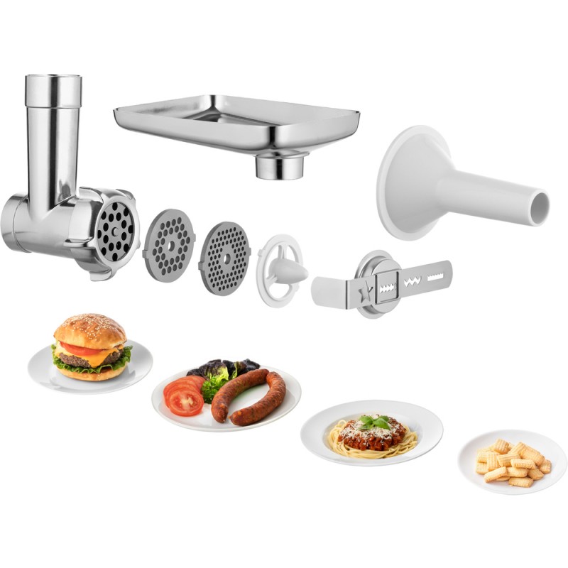 PROCESOR HRANE SENCOR VIŠENAMJENSKI MIKSER ZA HRANU Snažan motor od 1000 W za savršene rezultateVelika posuda od 4,5 l od nehrđajućeg čelika za sve vrste tijesta (0,8 kg teškog tijesta, 2,2 l laganog tijesta)6 postavki brzine + funkcija PULS + 2 programa NutriSmart za sve zadatkeJedinstvena LED svjetla za laku kontrolu nad konzistencijom tijestaMikser 4 napredna nastavka za miješenje i mućenje Poseban FLEXI nastavak za tučenje i FLEXI mutilica za lagana tijesta Jedinstveni magnetski poklopci daju veću praktičnost Miješalica za hranu Staklenka od 1,5 l Oštrice obložene titanijem Mlinac za meso grubo i fino mljevenje s nastavcima za punjenje kobasica 3 alata za izradu tjestenine/rezanaca Nastavak za kekse