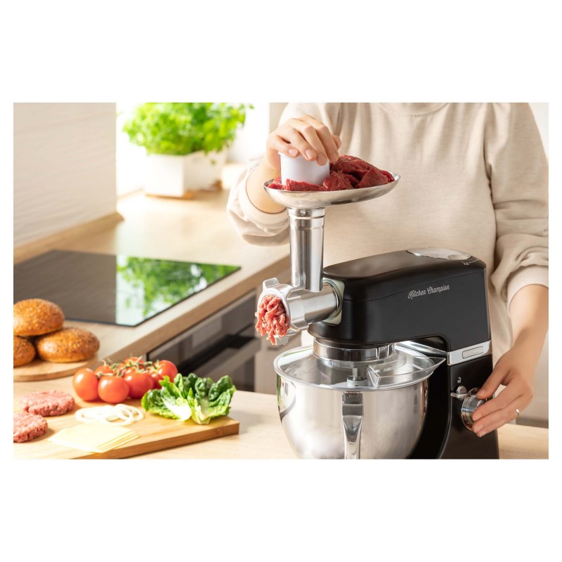 PROCESOR HRANE SENCOR   Snažan motor od 1 000 W s jamstvom 6 godina Robusno tijelo u cijelosti od metala i s metalnim zupčanicima Dizajn s 3 glavčine Sencor pametna snaga i energija – za optimalnu brzinu Regulator brzine s blagim započinjanjem i 8 razina brzine Impulsna funkcija LED rasvjeta posude za sjeckanje Posuda od nehrđajućeg čelika veličine 4,5 litara i mjernom ljestvicom Proziran poklopac posude s dovodnom cijevi za jednostavno dodavanja sastojaka tijekom sjeckanja Plastičan poklopac za skladištenje posude od nehrđajućeg čelika Planetarni sustav miješanje, sjeckanja i tučenja – osigurava potpunu nasjeckanost cjelokupnog sadržaja posude – nastavci simultano rotiraju oko svojih vlastitih osi, kao i oko osi motora – omogućuje obradu 100% sadržaj posude, jamči savršeno sjeckanje sastojaka Bajunetni sustav postavljanja nastavaka omogućuje brzo sklapanja i zamjenu Osiguravajuća blokada u gornjem položaju nagibnog kraka Staklena posuda za sjeckanje veličine 1,5 litara Aparat za mljevenje mesa za fino i grubo mljevenje 3 nastavka za miješanje, sjeckanje i tučenje – oštrica za miješanje, mlatilica A-profila, pjenjača za tučenje Specijalna FLEXI mlatilica za miješanje, pogodna za fina tijesta Punilica kobasica s 2 promjera Izrađivač kolača Tuče do 8 bjelanjaka Kapacitet posude 4,5 kg