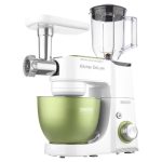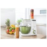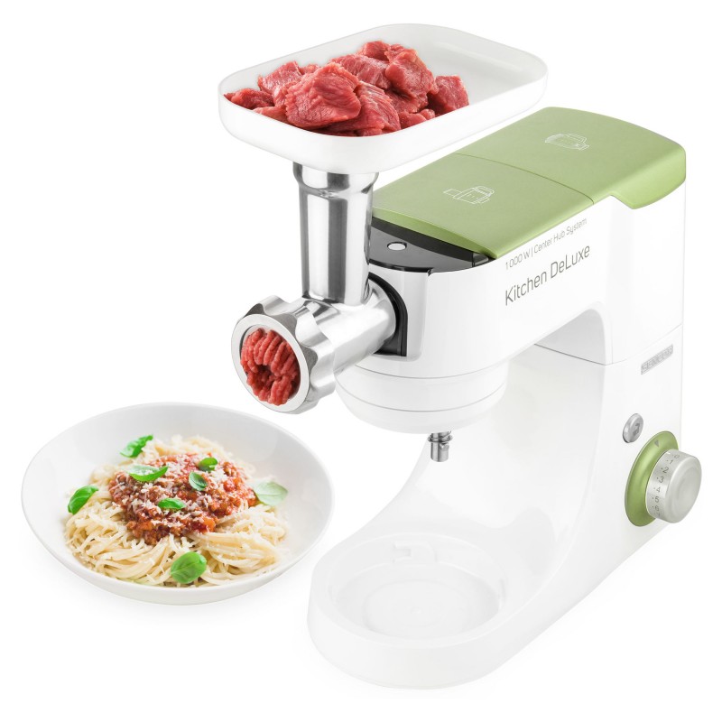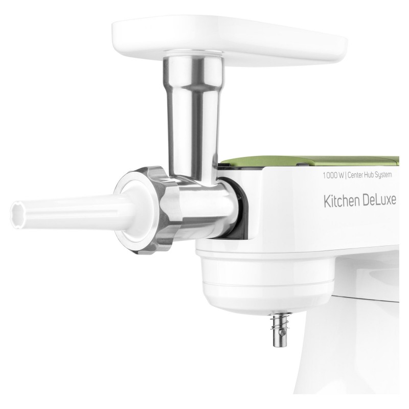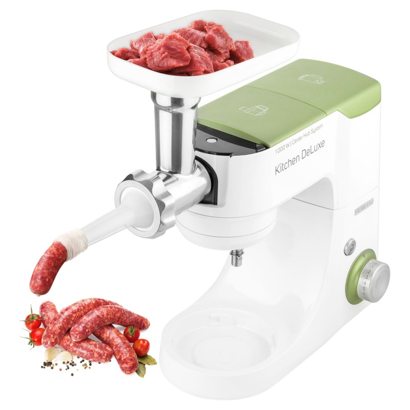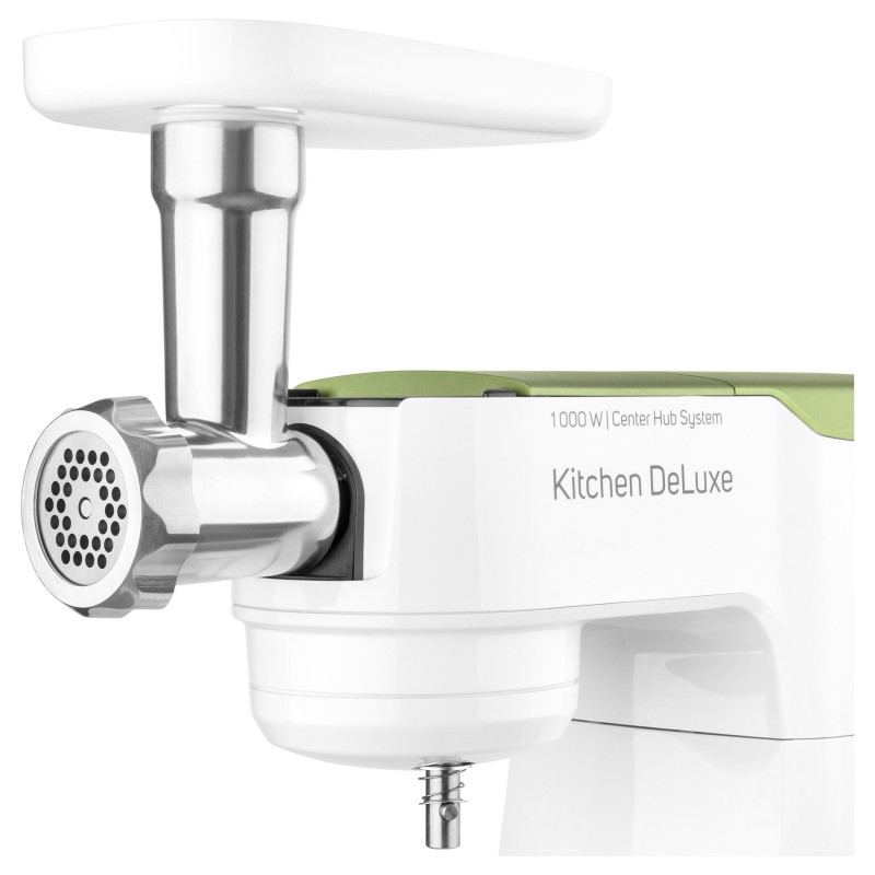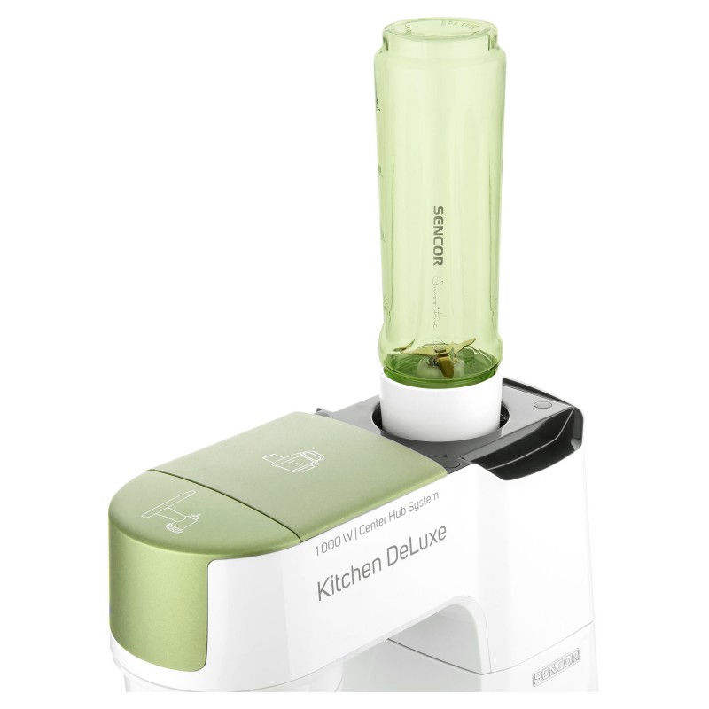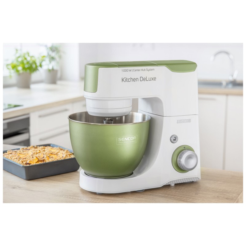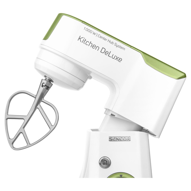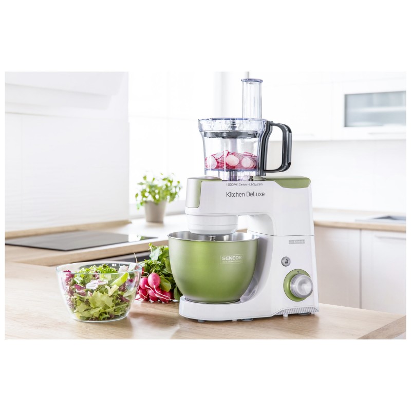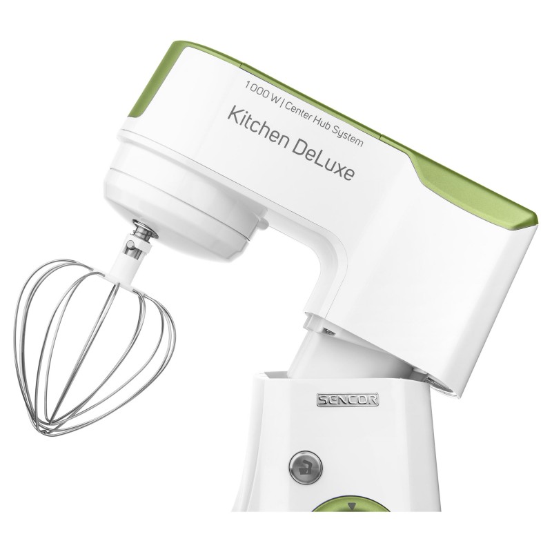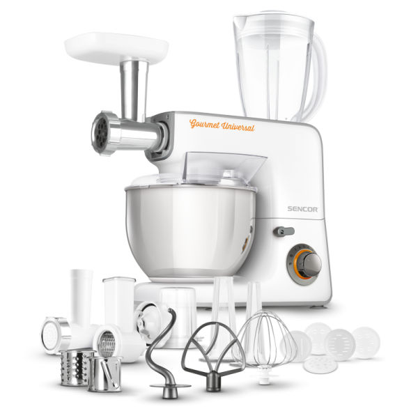 Izvanredno snažan motor od 1000 W sa 4 glavčine Aparat za salatu sa svim funkcijama štapne miješalice Sencor pametna distribucija napajanja i energije – za optimalnu brzinu Varijabilna regulacija brzine s postupnim pokretanjem i 8 razina brzine Funkcija impulsa Proziran poklopac zdjele s cijevi za umetanje omogućuje lako dodavanje sastojaka u toku miješanja Plastični poklopac zdjela od nehrđajućeg čelika za pohranu Planetarni sustav miješenja, miješanja i tučenja osigurava temeljito usitnjavanje svih sastojaka u zdjeli nastavci se simultano rotiraju oko svoje osi i oko osi kućišta sa zupčanicima omogućuje obradu 100% sastojaka u zdjeli jamči savršeno miješanje sastojaka Bajunetski sustav pričvršćivanja nastavaka omogućuje brzo sklapanje i zamjenu Sigurnosno zaključavanje sklopivog kraka u gornjem položaju 3 nastavka za miješenje, tučenje i lagana tijesta – oštrica za miješenje, nastavak za tučenje u obliku slova A, balonska mutilica Punilica kobasica u 2 promjera 2 tritanske boce s 2 štapića za led Stojeći mikser od 1,25 l s titanijskim oštricama Višefunkcijska miješalica za hranu od 1,25 L sa 4 nastavka i oštricom za sjeckanje Mlinac za meso za grubo i fino mljevenje s nastavcima za punjenje kobasica u 2 promjera Posuda za miješenje od 4,5 l od nehrđajućeg čelika s mjernom skalom Istovremeno tučenje do 12 bjelanjaka