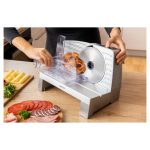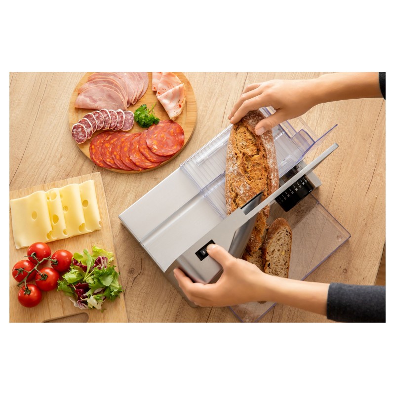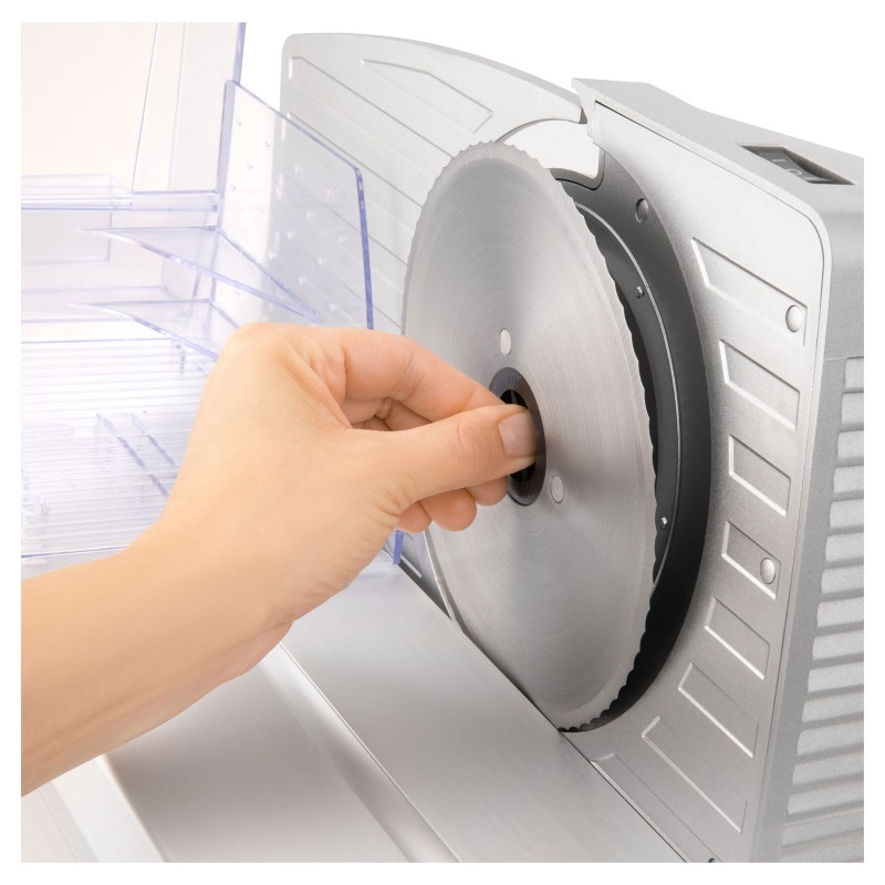 Odvojivi disk za rezanje od nehrđajućeg čelika (promjer 170 mm)Okretni gumb za besprijekorno podesivu širinu rezanja (0-23 mm)Odvojivi hod s zaustavljanjem u oba smjeraUlagač pritiska s hvatačima protiv nenamjernog pomicanja hrane tijekom rezanjaIzmjenjivi dijelovi za lako čišćenje i pranje Potrošnja energije 100 W, 220-240 V