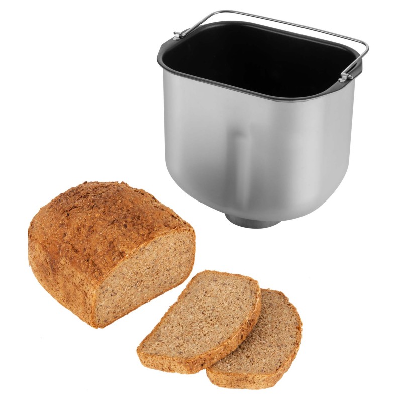 Luksuzni dizajn od nehrđajućeg čelika s vrhunskim velikim LCD zaslonom Automatski dozator Program kuhanja džemova i marmelada 3 postavke razine boje kore (svijetlo / srednje tamno / tamno) Funkcije i svojstva13-satni prekidač za odgođeni timerza pečenje 23 unaprijed postavljena programapečenja 1 unaprijed postavljeni program za kuhanje džemova i marmelada1 unaprijed postavljeni program za izradu samo tijesta (npr. za pizzu, bagete, peciva, krafne itd.)Maksimalna zapremina kruha 900 gPremium veliki LCD zaslon s programimaPoklopac s prozorom za gledanje 10 minuta memorije u slučaju nestanka struje (proizvođač kruha nastavlja peći)Držite toplu funkciju 60 minuta nakon završetka pečenjaNeprijanjajuća posuda za pečenje i kuke za miješanje za jednostavno održavanjeZvučni signal za pečenje siguran za perilicu posuđa Zvučni signal za dodavanje sastojaka koji zahtijevaju kraće vrijemeIsporučeni pribor: mjerna čaša, žlica i čelična kuka za uklanjanje, kuka za gnječenje Dimenzije i specifikacijeUlaz snage 550WProtuklizne nogeDimenzije (širina x dubina x visina): 360 x 275 x 335 mm