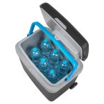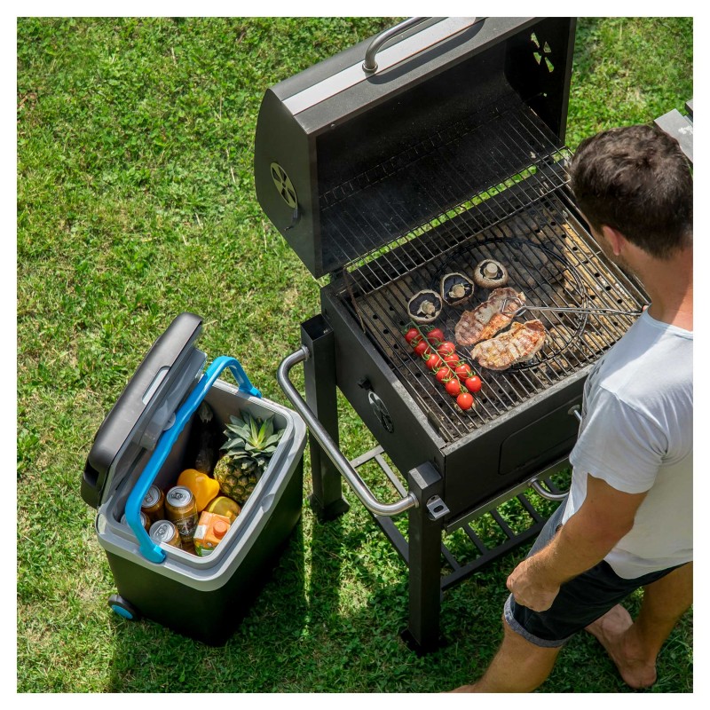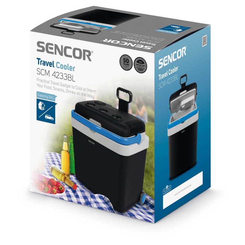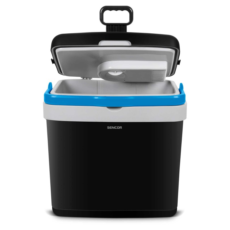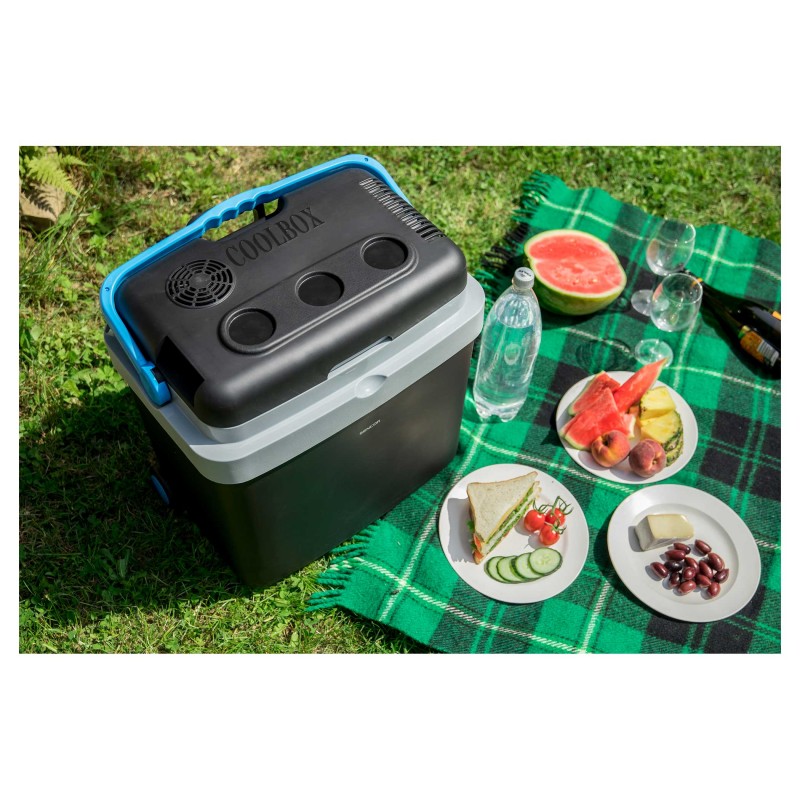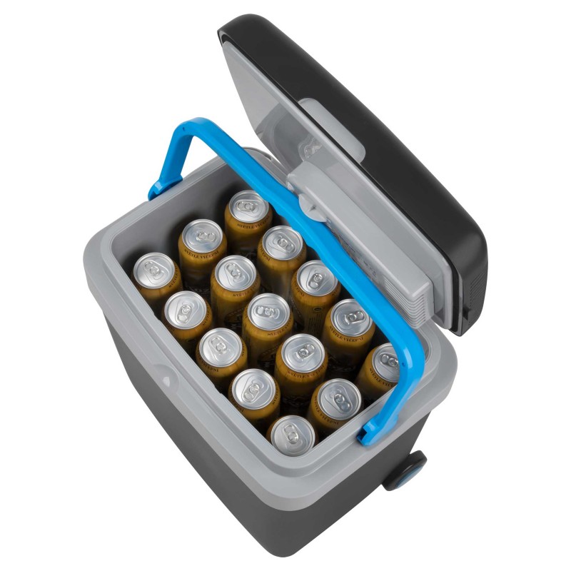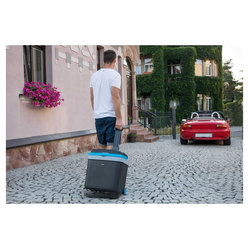 Suvremen dizajn s kapacitetom od 33 litre Jaka sklopiva ručka i veliki kotači Mogućnost hlađenja i grijanja Zeleno/crveno LED svjetlo signalizira hlađenje ili grijanjeZa upotrebu u automobilu i kućanstvu (dvostruko napajanje 12/230 V)Odvojiva razdjelna rešetka za praktično raspoređivanje sadržaja Velika ručka za lako nošenjePriključak na utičnicu od 12 V (automobilski upaljač) / utičnicu mrežnog napajanja od 230 VNačin rada ECO kada se napaja s 230 V (hlađenje će prestati kada se dostigne 12 °C)Prostor za devet PET boca od 1,5 litara ili pet PET boca od 2 litre, kada je poklopac zatvorenHladi do 16-18 °C ispod okolne temperatureOdvojivi poklopac DVOSTRUKI ZAŠTITNI SUSTAV ZATVARANJA poklopac se može otvoriti samo ako je ručka zaklopljena plastična blokada na gornjem poklopcu, otvoreni poklopac ne može pasti i ozlijediti nečije ruke Ventilacijski sustav s dugotrajnim motorom bez četkicaKvalitetna izolacijaUlazna snaga 60 WDužina kabela napajanja za 12 V: 2 mDužina kabela napajanja za 230 V: 1,8 mMasa: 7 kg