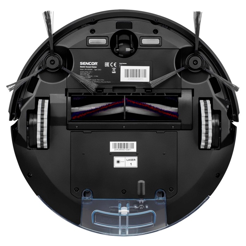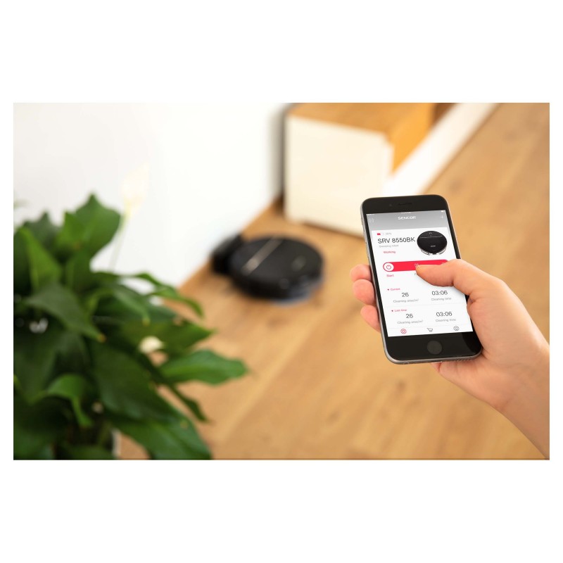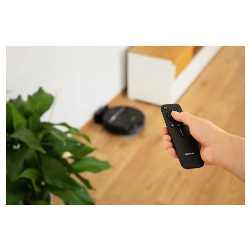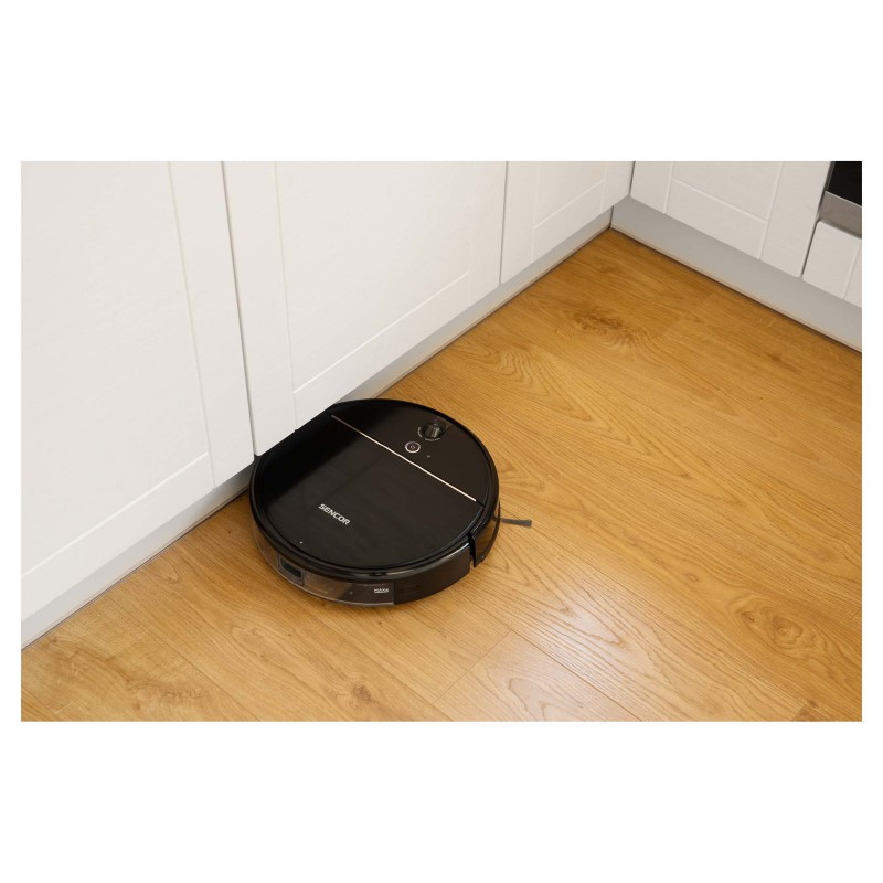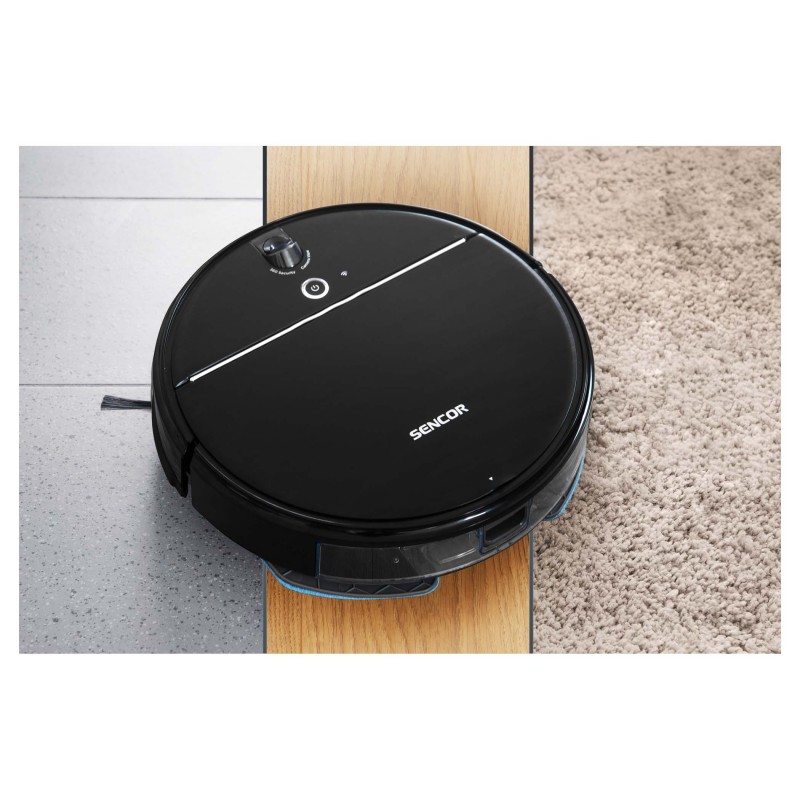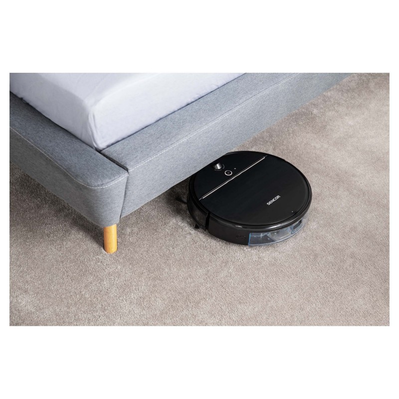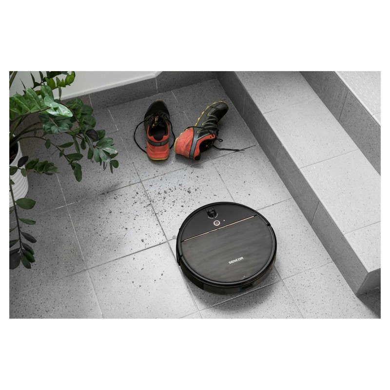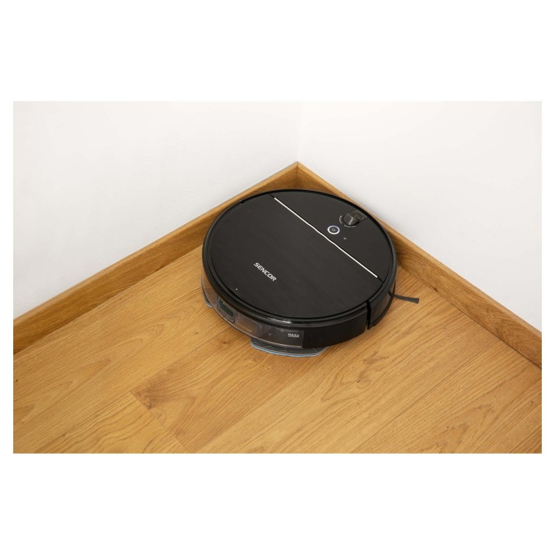 ROBOTSKI USISAVAČ Snaga SUPER USISAVANJA od 4000 Pa Idealan za usisavanje tepiha, laminata, parketa, linoleuma, pločica, itd. Infracrveni prednji senzor protiv sudara Vrlo tih rad prikladan za kućne ljubimce. BLDC motor od 60 W za dug vijek trajanja Sustav navođenja Sencor Nav. 16.0 Žiroskop, infracrveni senzori i senzori za detekciju stepenica i drugih prepreka Aktivni sustav mapiranja prostora Sustav kamere za glasovnu i video interakciju Sustav usisavača s rotacijskim četkicama: Snažna središnja rotacijska četka je idealna za usisavanje tepiha i tvrdih podova 2 rotacijske bočne četkice za savršeno čišćenje kutova Širok raspon senzora Senzor trake odbojnika za prepoznavanje zapreka Senzor za stepenice omogućuje bezbrižnu upotrebu u zgradama s više katova. Senzor za preciznu navigaciju omogućuje automatsko vraćanje do stanice za punjenje Funkcija „krpe“ (mokro brisanje) Uključen spremnik za vodu i krpa za brisanje Protok vode se regulira pomoću električne pumpe s 3 razine intenziteta Program cik-cak za izvanredno čišćenje poda Podesive postave mjerača vremena (automatski početak čišćenja na zadani dan, sat i minutu): samo jedan dan tjedno više dana tjedno samo radnim danima samo vikendima Vrijeme rada do 90 minuta po jednom punjenju Daljinsko upravljanje putem WiFi aplikacije za mobilni telefon Postaja za punjenje Automatski povratak do stanice za punjenje nakon dovršetka programa. Automatski povratak do stanice za punjenje kada baterija postane slaba Automatsko isključivanje ako se kotači zaglave Može prelaziti preko pragova visine do 1,5 cm Automatsko praćenje servisa s prikazom poruka upozorenja na zaslonu daljinskog upravljača Svjetlo indikatora statusa na kućištu usisavača (stanje mirovanja, punjenje, napunjen do kraja) Spremnik za prašinu – 250 ml Spremnik za vodu – 450 ml Baterija: 2600 mAh, litij-ionska (potpuno punjenje nakon približno 3 sata) Razina buke: < 65 dB