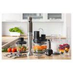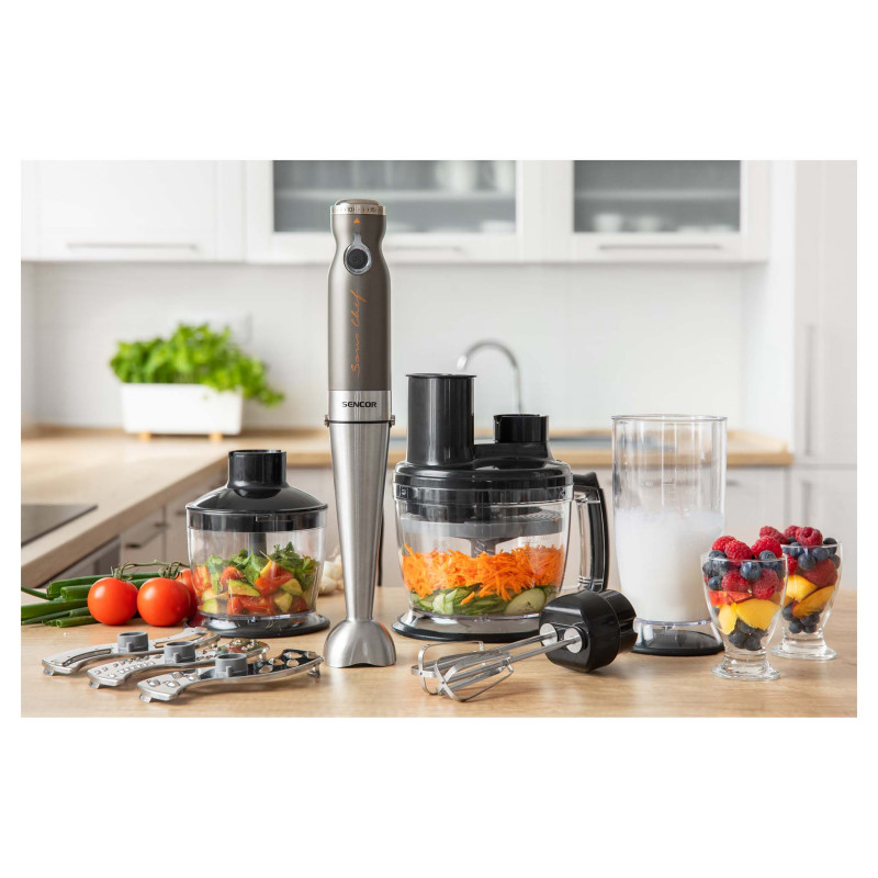 Uživajte u mojim svestranim značajkama do maksimuma i uštedite vrijeme i prostor u kuhinji! Predstavljam se kao ručni mikser Sencor SHB 5501CH-EUE3 i nudim devet funkcija / priključaka u jednom. Snaga od 1200 W vrlo je respektabilna i osigurava sjajne rezultate, bilo miješanje, bičevanje, sjeckanje, ribanje ili drobljenje. IMAM 6-GODIŠNJE MOTORNO JAMSTVO Možete raditi sa mnom znajući da moj motor postiže najbolje rezultate i da će trajati! Sencor me opremio tako kvalitetnim motorom da mi je dao 6-godišnje jamstvo. Nije li to sjajno? IMAM LI STVARNO 20 BRZINA? Uživajte u udobnom radu s ergonomskom ručkom koja se savršeno uklapa u svaku ruku! Na okretnom gumbu možete postaviti do 20 brzina za rukovanje i mekim i tvrdim prehrambenim proizvodima, od kaše do orašastih plodova ili leda. POMIJEŠAJTE ILI PRIPREMITE UKUSNE POSLASTICE S DVA DODATKA Možete pomiješati juhe i smoothieje ili napraviti ukusnu kremu ili majonezu. Sa svojom ergonomskom drškom, radim kao san. Na njega stavite par pjenjača i štapić za miješanje. Oba su izrađena od nehrđajućeg čelika, a glava šipke ima četiri visokokvalitetna noža od nehrđajućeg čelika obložena titanijem kako bi se očuvala maksimalna razina hranjivih tvari. Radi praktičnosti možete koristiti posudu za miješanje od 800 ml. SJECKAM LUK, MESO I ORAŠASTE PLODOVE U TREN OKA Više nećete morati dobivati sve teary-eyed prilikom rezanja luka i jednostavno ćete uštedjeti vrijeme prilikom pripreme sastojaka za kuhanje. Posuda za sjeckanje od 500 ml ima vlastitu oštricu od nehrđajućeg čelika, koja pouzdano usitnjava, osim voća i povrća, i orašaste plodove, meso ili led za dobar koktel. Uštedite vrijeme i suze u samo nekoliko koraka. ZNATE LI ŠTO JE VIŠENAMJENSKI PROCESOR HRANE? Višenamjenski procesor razlikuje se od klasičnog uglavnom zbog noža u obliku srpa, kao i nekoliko dodataka za rezanje, rezanje i ribanje, ovisi o hrapavosti koju želite. Želite li naribati mrkvu ili krastavce za salatu ili domaće sastojke namaza? Nema frke! Procesor hrane ima stvarno veliku količinu od 1250 ml za lijepu količinu prehrambenih proizvoda. OSIGURAVAM STABILAN RAD NA STOLU I KUHINJSKOM PULTU Imam nekoliko plovila koja nadopunjuju moje višenamjenske sposobnosti. Sve posude imaju protuklizni jastučić, što jamči njihovu savršenu stabilnost. GLAVNE PREDNOSTI 6-GODIŠNJE JAMSTVO za motor TITANIUM Četverostruka oštrica Tehnologija Ulaz snage 1 200 W Kontinuirana kontrola brzine (20 brzina) Ergonomski oblikovana ručka Nastavak od nehrđajućeg čelika koji se također može koristiti za miješanje vruće hrane DIMENZIJE I SPECIFIKACIJE Glavni prekidač za napajanje s LED gumbima za otpuštanjepričvršćivanja pozadinskog osvjetljenjaViseća petljaDuljina kabela za napajanje: 1,2 m