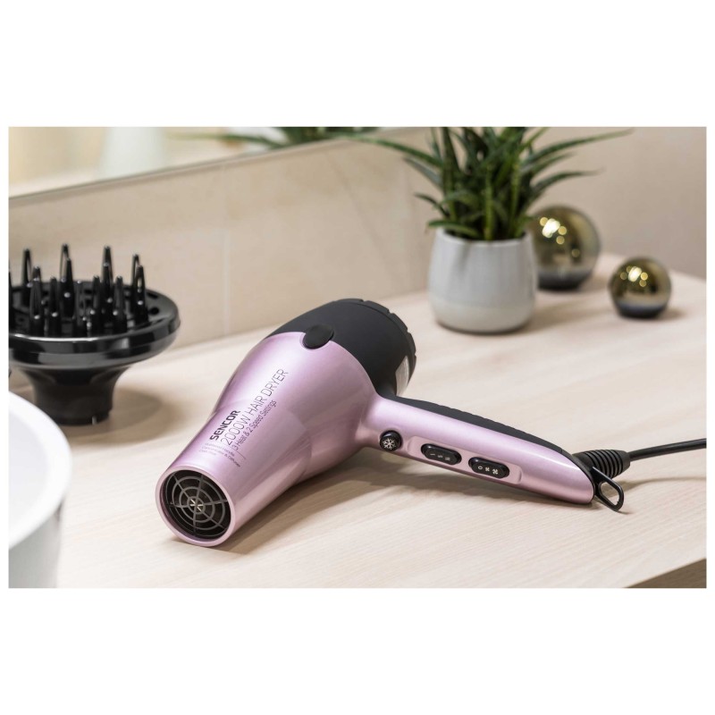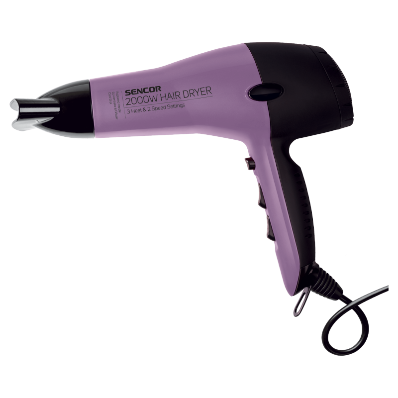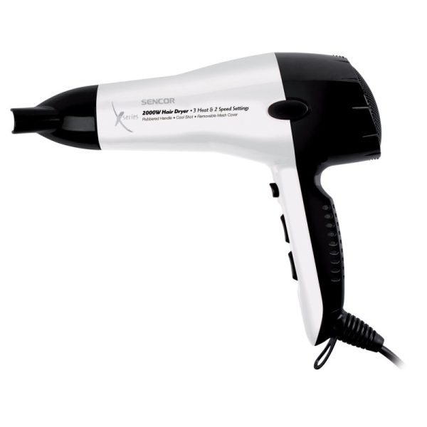 Ulazna snaga 2 000 W Ultra lagan dizajn 3 postavke temperature 2 postavke brzine Zračna mlaznica Raspršivač Gumb za hladni zrak Odvojiva stražnja rešetka za lakše čišćenje Stražnji dio ručke presvučen gumom Petlja za vješanje Gumeni bočni štitnici sprječavaju grebanje sušila kad se odloži Termalni osigurač štiti motor od pregrijavanja Dužina kabela napajanja: 2,6 m