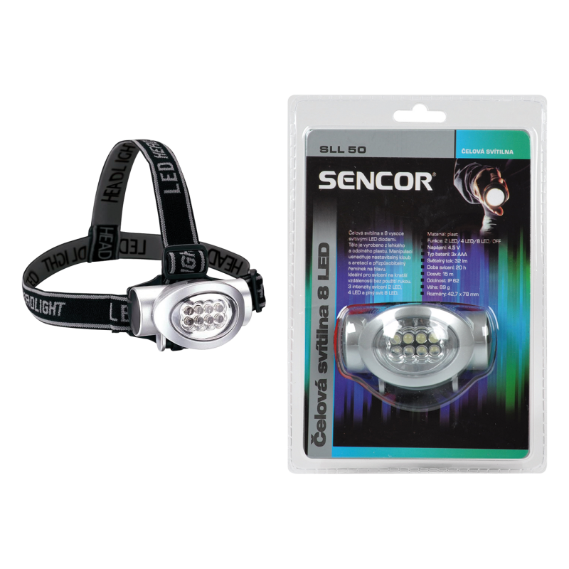 Svjetiljka za glavu s 8 vrlo blistavih LED diodaTijelo svjetiljke od lagane trajne plastikeSastoji se od prilagodljivog zgloba s ključem i prilagodljive trake za glavuIdealno za rasvjetu bliskih predmeta bez korištenja ruku3 načina rada: 2 LED, 4 LED, i puni sjaj s 8 LED dioda8 LED dioda izuzetno jakog sjaja – 3 načina radaOtporna na vlagu, udarce i prašinuDoseg: 15 mKoličina svjetla: 32 lmIzvor napajanja: 4.5V, 3x AAA (R03)Životni vijek diode: do 100.000 satiTrajanje osvjetljenja (neprekidno): s LR03 – 20 h