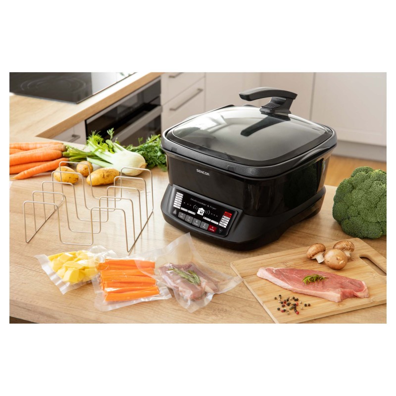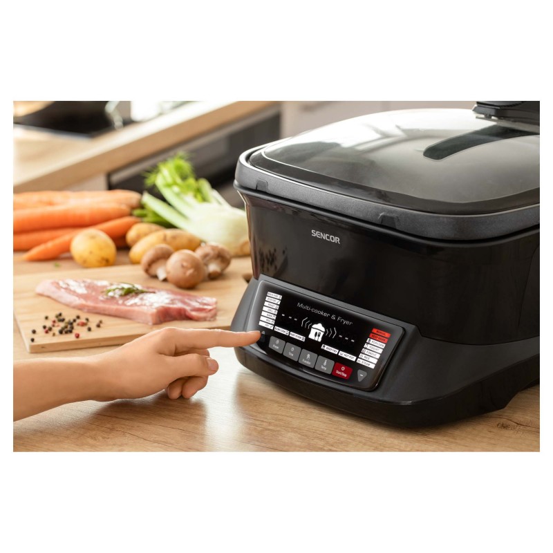 JA SAM MULTIFUNKCIONALNI LONAC SFR 9300BK TVRTKE SENCOR U kuhinji ću biti izvrstan pomagač zdravog kuhanja velikim i malim. Ja sam multifunkcionalni lonac SFR 9300BK tvrtke Sencor i za minimum rada dobivate obroke pune vrijednosti pune okusa i hranjivih sastojaka, bez potrebe za puno masnoće, soli ili začina. Dopuštam vam da lako pripremite savršen obrok koji košta samo djelić vremena, a uz to ćete i uživati.  RADIM S POSUDOM ZA KUHANJE ZAPREMINE 8 LI ZA VEĆU OBITELJ  Mogu pripremiti hranu za do 10 ljudi. Opremljen sam kvalitetnom posudom za kuhanje koja se može pohvaliti zapreminom od 8 li za veće kućanstvo. Posuda za kuhanje vrlo je kvalitetna, njena unutrašnjost je presvučena slojem koji se ne lijepi, za sve ponuđene toplinske tretmane. Sve što trebate je nasjeckati sastojke, staviti ih u lonac, odabrati način rada i to je to!    PREDSTAVLJAM VAM KUHANJE U VAKUUMU Ova tehnološka preinaka je jednostavno izvrsna! A što zapravo donosi ova vrlo popularna metoda kuhanja? Tretman Sous-Vide je kuhanje na konstantno niskoj temperaturi u hermetički zatvorenoj plastičnoj posudi koja se potom uroni u vodenu kupelj. Na taj način mogu pripremiti, na primjer, meso, ribu, povrće, ali i jaja. Rezultat je doslovno eksplozija jakih i sočnih okusa u koju ćete se jednostavno zaljubiti.  ZA SVOJ RAD KORISTIM 18 AUTOMATSKIH PROGRAMA Svih 18 programi su prilagođeni Vašim individualnim potrebama, a čak možete koristiti mogućnosti prilagodbe vremena i temperature između 40-240 ° C . Kuhajte sa mnom i uživajte u ukusnim jelima koja ostaju topla i do nekoliko sati zahvaljujući funkciji Keep Warm (Ugrevaj se) ili iskoristite odgođeni početak kuhanja.     Kuhanje u vakuumu –  Skuhajte ukusni komad mesa s omiljenim začinima i začinskim biljem. Meso kuhano u vakuumu eksplozija je okusa, sočnosti i hranjivih sastojaka.  Teško prženje –  odaberite je za jako prženje sastojaka na maloj količini vrlo vrućeg ulja. Program je pogodan za meso i ribu, koje se mogu miješati s prilozima poput rezanca ili riže. Pečenje –  Koristite program za pečenje, prženje ili pečenje mesa, povrća, peradi itd. Roštilj –  Savršeno za trenutke kada želite uživati ​​u dobrom mariniranom komadu mesa ili sočnom povrću uz mrlju roštilja.  Pečenje –  Program je pogodan za pripremu mirisnih kolača, kolača, keksa i drugih slatkih i slanih jela. Kuhanje –  izvrstan program za kuhanje tjestenine, krumpira, riže, povrća, juha i umaka, okruglica itd. Prženje –  ovaj je program prikladan za prženje hrane djelomično uronjene u ulje, poput domaćeg odreska. Polako kuhanje –  Idealno za pripremu laganog mesa i svih vrsta umaka. Samo izrežite i stavite u lonac i više ne morate brinuti ni o čemu. Brzo pirjanje –  Program je idealan za pirjanje mesa, jetre, ribe ili povrća. Omogućuje vam pripremu sočne hrane slične loncu pod tlakom. Duboko prženje –  program savršen za prženje hrane potpuno uronjene u ulje, poput krafni ili rakova. Vruća posuda –  kuhanje iskrene juhe točno na stolu za blagovanje. Kako se juha postupno uklanja s tanjura, nadopunjuje se sastojcima, koji se ponovno prokuhaju i zatim posluže. Kuhanje na pari –  izvrstan kandidat za najzdraviju pripremu širokog spektra hrane. Hrana će biti bez dodanih masnoća, uz zadržavanje punog okusa i boje. Riža –  Pripremite rižu svih vrsta, slanu ili slatku ili s raznim orijentalnim začinima. Fundue –  za kuhanje umaka od čokolade, sira ili mesa ili dodataka za umakanje raznih delicija od sira preko voća do povrća. Paket također uključuje visokokvalitetne vilice od nehrđajućeg čelika za iglanje. Jogurt –  Savršen za pripremu jogurta od kravljeg i kozjeg mlijeka. Napravite jogurt točno prema svojim idejama. Kokice – ukusne kokice mogu se pripremiti bez ulja ili s malom količinom ulja ili masti. Dovoljno je začiniti gotove kokice po vašem ukusu. Održavanje temperature (ODRŽAVAJTE TOPLO) –  Hranu držim toplom nekoliko sati nakon završetka pripreme. Ručno podešavanje –  Temperatura i vrijeme mogu se namjestiti prema potrebi. Odgođeni početak –  lako možete odgoditi vrijeme kuhanja na vrijeme koje vam više odgovara.   S ULAZNOM SNAGOM OD 1800 W RADIM BRZO  Moja potrošnja energije od 1800 W osigurava brzu pripremu hrane. Zagrijat ću se za nekoliko minuta i za kratko vrijeme moći ću pripremiti ukusan obrok. Možete se opustiti s obitelji i prijateljima dok pripremate večeru. Zvučni tajmer upozorit će vas kad je hrana gotova.   A KOJA JE MOJA KORIST ZA DOMAĆINSTVO? Osim vremena, uštedjet ću i novac. Moj rad je znatno niži u energiji nego kod klasičnog električnog ili indukcijskog kuhala. Uz sve to, kuham ravnomjerno, polako, čak i bez dodavanja masnoće, pazim i na maksimalan okus, sočnost i očuvanje hranjivih sastojaka.   MOJA GLAVNA PREDNOST Omogućuje višenamjensku toplinsku obradu s 18 programa Skraćuje postupak kuhanja za više od polovice Lonac uključuje široku paletu dodataka   OPIS PROIZVODA Jednostavan za korištenje pozadinskim osvjetljenjem digitalni LED zaslonbogat pribor uključene u paketVolumen unutarnjeg lonac 8 l savršeno odgovara cijela obiteljmože udaljiti lonac ima visoke kvalitete non-stick aluminijske legure unutarnje površinelonac može biti pohranjeni u hladnjaku i prati u perilici posuđaelegantnim crnim dizajnom uklapa u svaki interijer kuhinjaSavršeno za putovanja u vikendDigital postavke temperature u rasponu od 40-240 ° C18 automatskih programa jamči udoban radSous VideTeška prženjenazdravljajućigrilupečenjekuhanjeprženjesporo kuhanjeBrzo juhaprženjeVruće lonce napariRiža za kuhanjefondujogurtkokiceIzvrsno za kuhanje juhe, gulaša, džema, janjetine, govedine, povrća, jaja itd. Nudi nekoliko praktičnih funkcija Odloženi start / funkcija kuhanja KEEP WARM funkcija – održavanje temperature hrane Mogućnost podešavanj