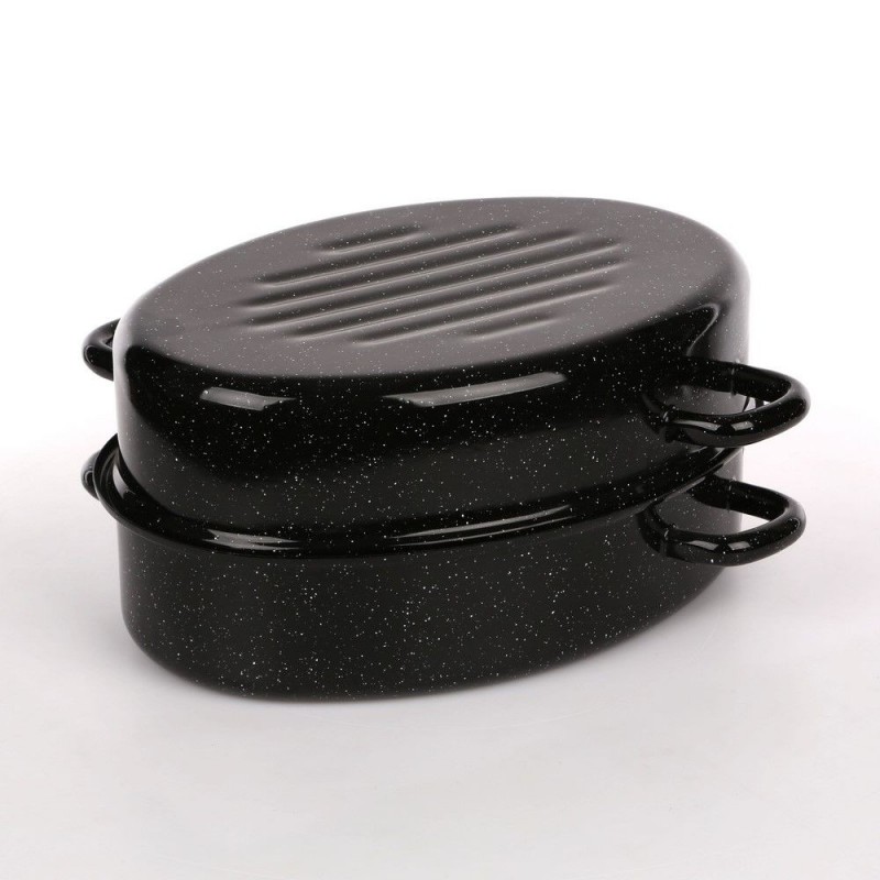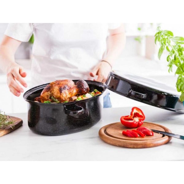 Dimenzije posude za pečenje:promjer: 42 cmvisina: 20 cmkapacitet 5,8 Litara + 11 Litara Pečenje i prženje u emajliranom jelu od pečenja jamči sjajan okus i aromu pripremljenih jela uz održavanje svih hranjivih vrijednosti . Posuda za pečenje idealna je za pečenje, prženje i kuhanje jela . Emajlirani premaz sprječava da se posuđe lijepi, olakšava održavanje posuđa čistim, otporan je na ogrebotine i visoke temperature . Ne sadrži nikal, pa je potpuno siguran za osobe s alergijom . Optimalna debljina čelične konstrukcije osigurava ravnomjernu raspodjelu topline i smanjuje rizik od opeklina . Konveksni oblik poklopca povećava kapacitet posude, a sustav dvostruke ručke omogućuje da se poklopac koristi kao dodatna posuda za posluživanje. · · Zahvaljujući prikladnim ručkama , posudu možete sigurno izvaditi iz pećnice . Prilagođena je svim vrstama štednjaka, uključujući indukcijske štednjake .