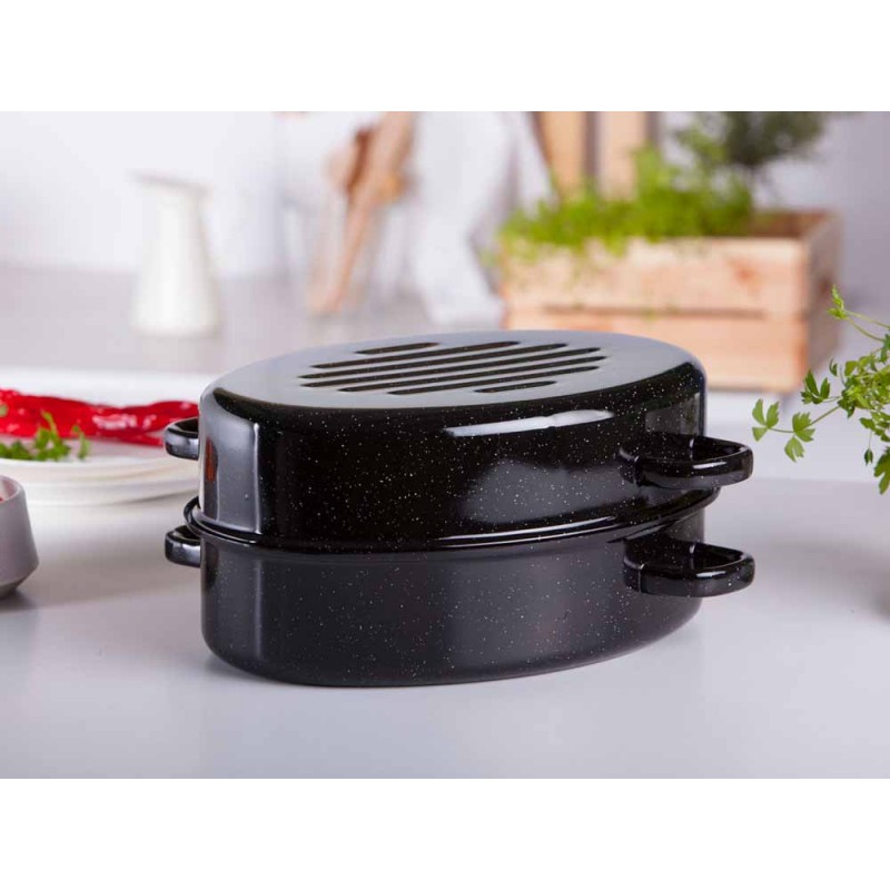 Dimenzije posude za pečenje:promjer: 30 cmvisina: 15 cmkapacitet: 2,8 Litara + 2,8 Litara Pečenje i prženje u emajliranom jelu od pečenja jamči sjajan okus i aromu pripremljenih jela uz održavanje svih hranjivih vrijednosti . Posuda za pečenje idealna je za pečenje, prženje i kuhanje jela . Emajlirani premaz sprječava da se posuđe lijepi, olakšava održavanje posuđa čistim, otporan je na ogrebotine i visoke temperature .   Ne sadrži nikal, pa je potpuno siguran za osobe s alergijom .   Optimalna debljina čelične konstrukcije osigurava ravnomjernu raspodjelu topline i smanjuje rizik od opeklina .   Konveksni oblik poklopca povećava kapacitet posude, a sustav dvostruke ručke omogućuje da se poklopac koristi kao dodatna posuda za posluživanje. ·      Zahvaljujući prikladnim ručkama , posudu možete sigurno izvaditi iz pećnice .   Prilagođena je svim vrstama štednjaka, uključujući indukcijske štednjake .