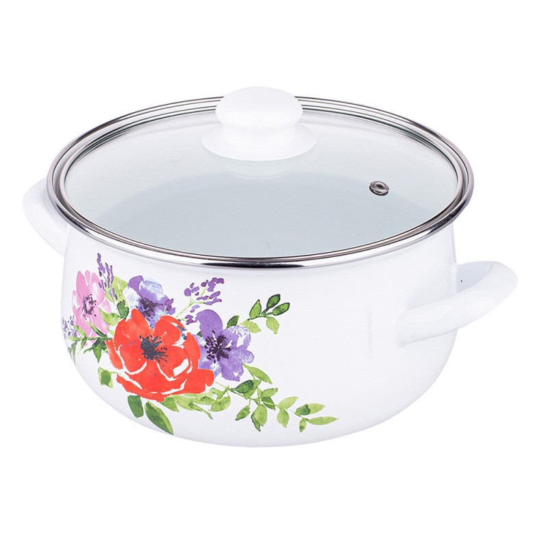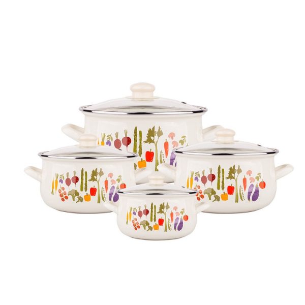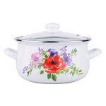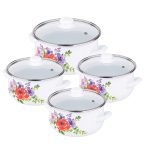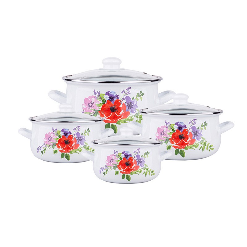 Set lonaca Silesia Rybnik za plin i indukciju Klara sa staklenim poklopcima, dekor cvijeće Emajlirani lonci nježnih boja u kojima kuhate ukusno i zdravo. Set lonaca uključuje: 1 x lonac s poklopcem 16 cm, kapacitet – 1,8 l,1 x lonac s poklopcem 18 cm, kapacitet – 2,4 l1 x lonac s poklopcem 20 cm, kapacitet – 3,3 l1 x lonac s poklopcem 22 cm, kapacitet – 4,8 l