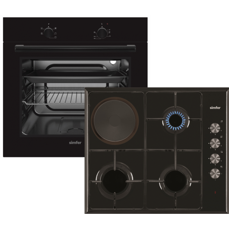 Simfer ugradni set BIOH 31B5B uključuje visokokvalitetnu pećnicu s ventilatorom i kombiniranu ploču za kuhanje na plin.   SIMFER ugradbena pećnica 5 funkcija pečenja kapacitet pećnice 56 l uključen pladanj i rešetka crna boja Dimenzije: 60 x 60 cm ENERGETSKI RAZRED: A   SIMFER ugradbena ploča kombinirana ploča emajlirani nosači posuda 3 plinske + 1 električna površina (1000 W) pripremljeno za prirodni plin ili plinsku bocu boja: emajlirano crna  Dimenzije: 58 x 51 cm