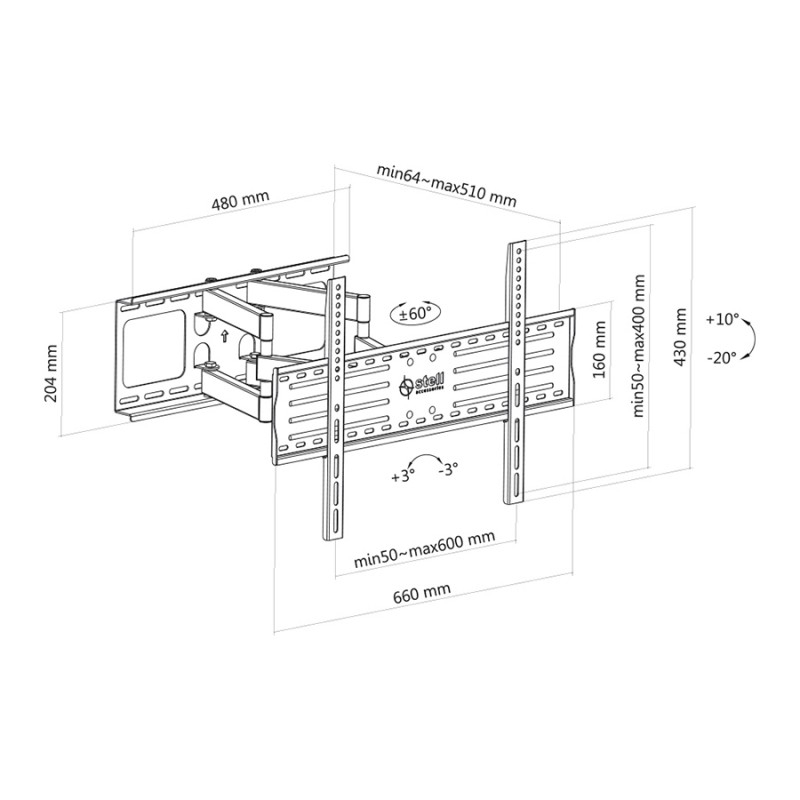Teleskopski podesiv SLIM držač za televizor Min. veličina zaslona: 40 ” Maksimalna veličina zaslona: 70″ Nagib: + 10 ° Nagib prema dolje: -20 ° Rotacija: +/- 45 ° Korekcija ravnine: +/- 3 ° Min. udaljenost od zida: 6,4 cm Maks. udaljenost od zida: 51 cm Maksimalno opterećenje: 60 kg Širina: 660 mm Visina: 431 mm Dubina: 70 mm Minimalno nagib: 34×160 mm Maksimalno nagib: 600×400 mm VESA 200×200 VESA 300×200 VESA 400×300 VESA 400×300 VESA 400×400 VESA 600×200 VESA 600×300 600×0000 Boja: Crna Materijal: Čelik Osigurač protiv povlačenja