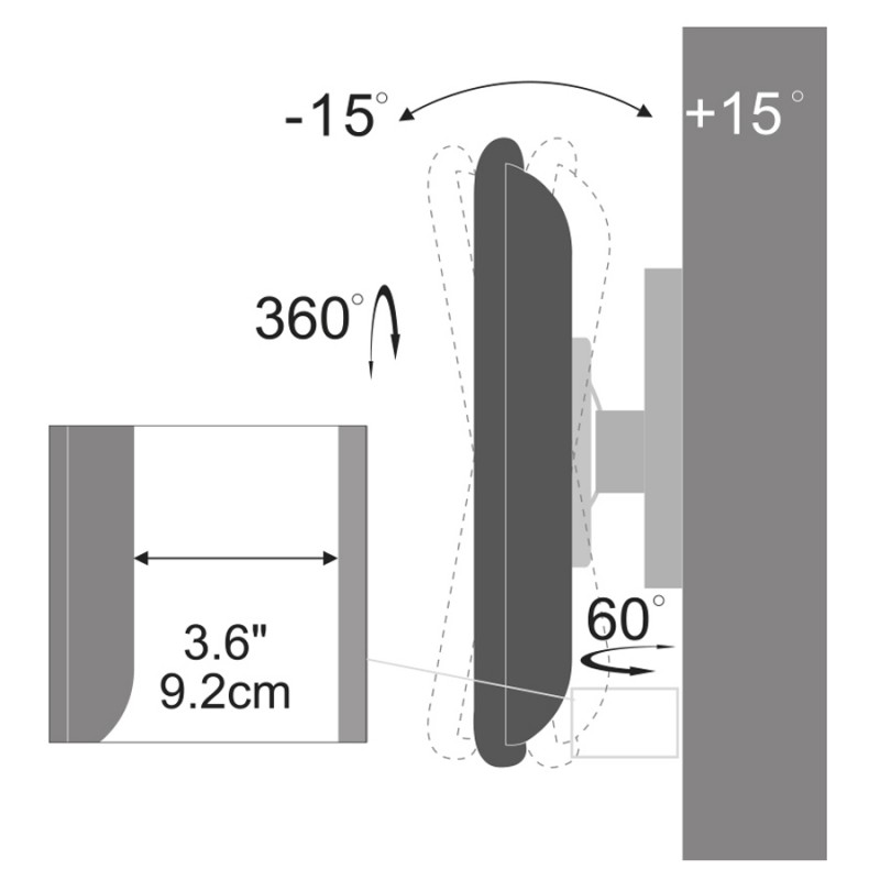 Za TV: 13-40 “/ 33-100 cm 1 zglob, vertikalni i horizontalni nagib i rotacija Nagib: + -15 °, Nagib: + -30 °, + 180 ° rotacija Maksimalna nosiva masa: 20 kg Udaljenost od zida: 9.2 cm Boja: crna Materijal: čelik / aluminij Integrirana libela VESA 75, 100, 200×100, 200×200