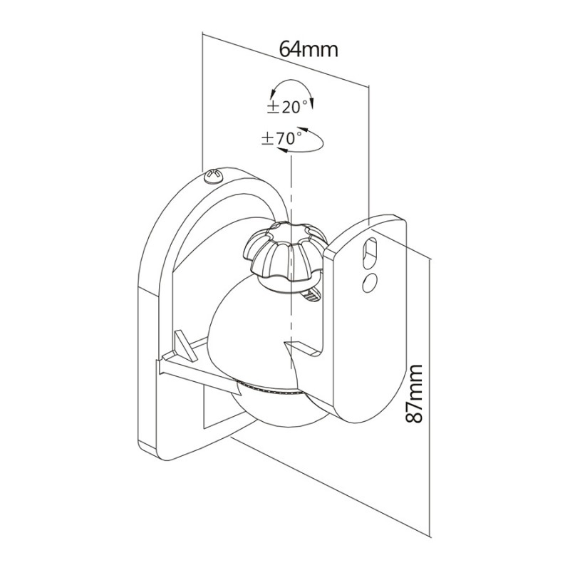 Univerzalni držač zvučnika dizajniran za zidnu montažu. Nagib +/- 20 °, Rotacija -70 ° do + 70 ° Dimenzije 87 x 64 mm Maksimalno opterećenje 3,5 kg Instalacija je vrlo jednostavna i uključen je sav potreban pribor.